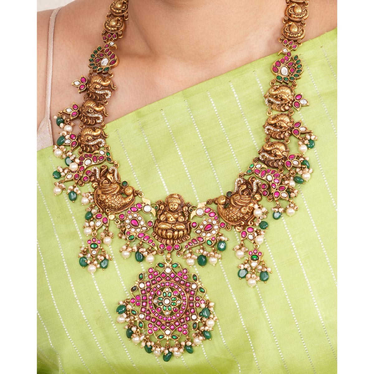 This 92.5 Silver, 24 kt Gold-Plated Lord Vishnu Goddess Lakshmi Necklace is adorned with Semi-precious Kundan Stones for a luxurious aesthetic.