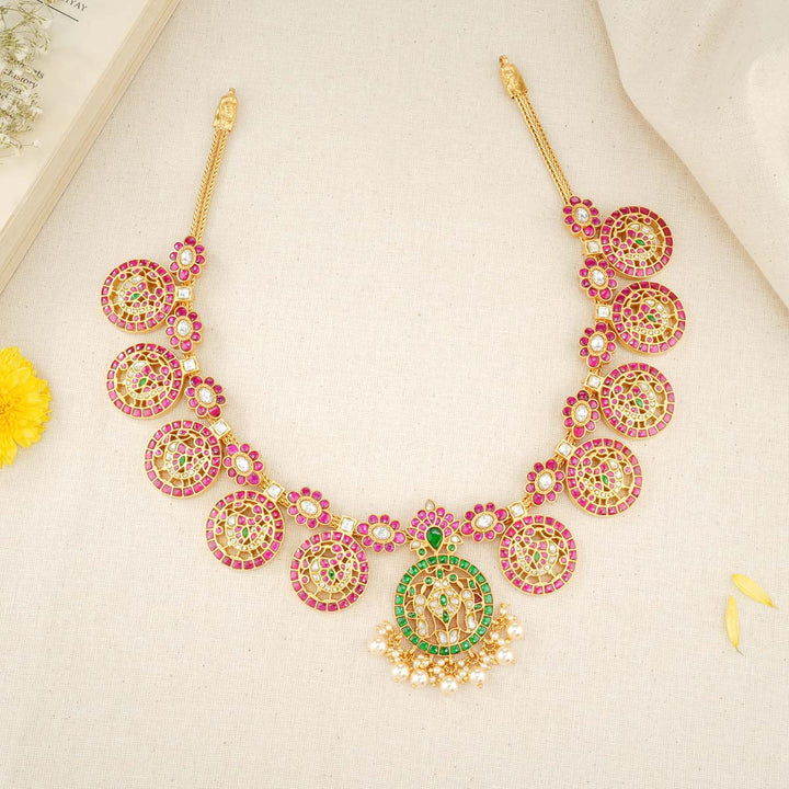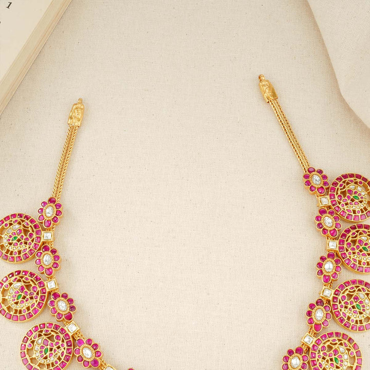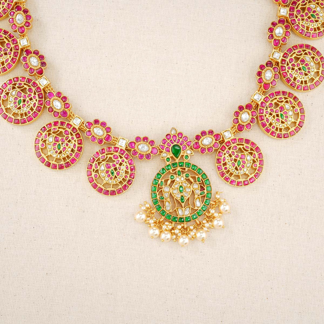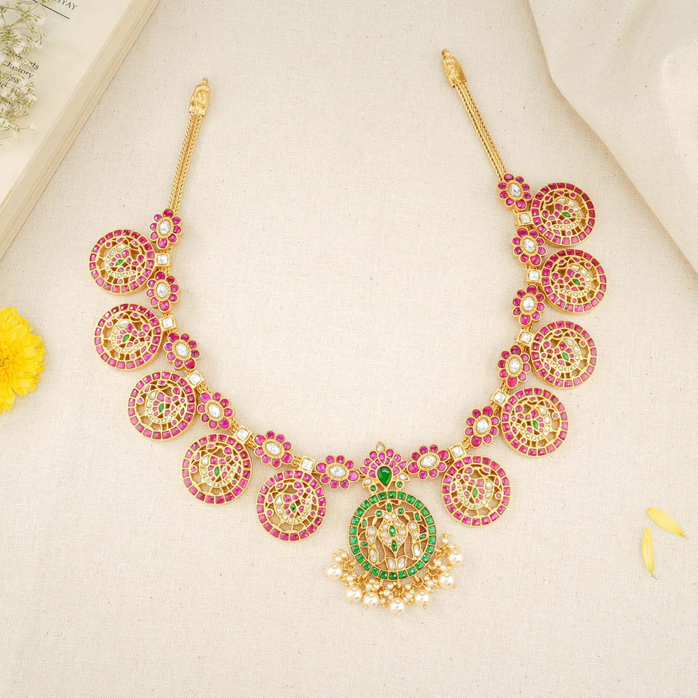 This 92.5 Silver, 24 kt Gold-Plated Necklace is adorned with Semi-precious Kundan Stones for a luxurious aesthetic.