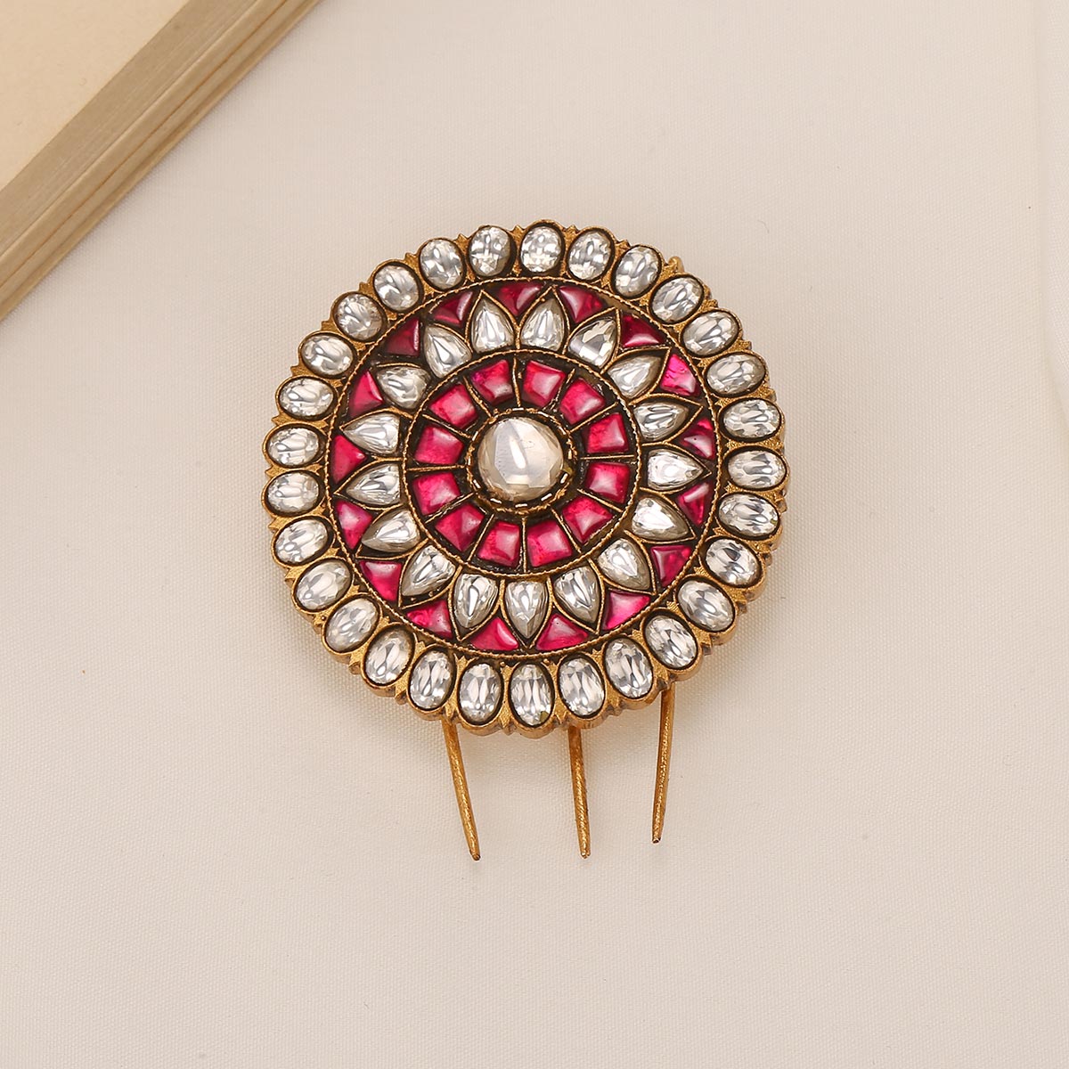 This 92.5 Silver, 24 kt Gold-Plated Jada Billa is adorned with Semi-precious Kundan Stones for a luxurious aesthetic.