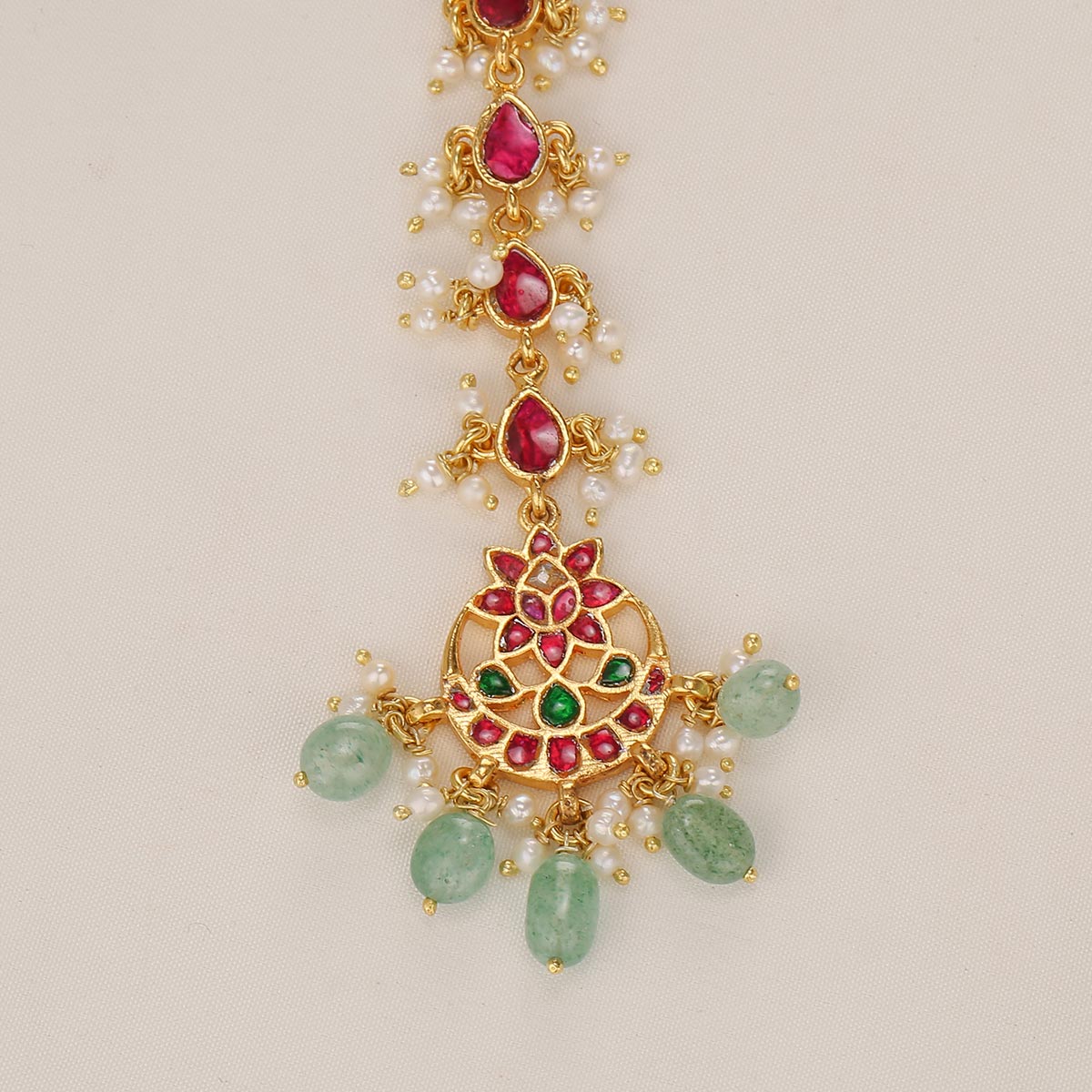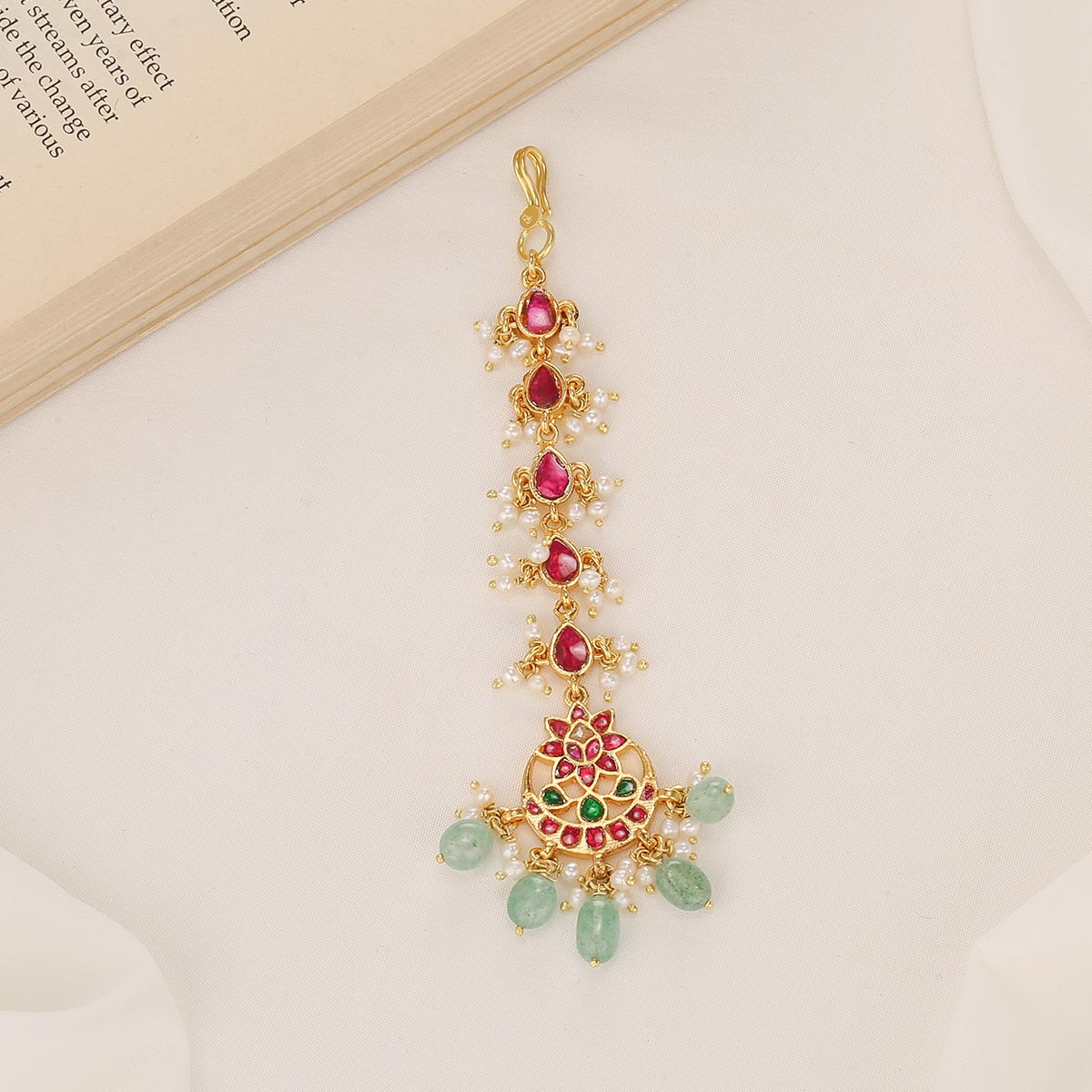 This 92.5 Silver, 24 kt Gold-Plated Maangtikka is adorned with Semi-precious Kundan Stones for a luxurious aesthetic.