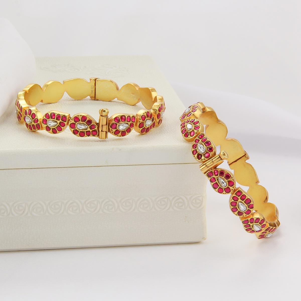 This 92.5 Silver, 24 kt Gold-Plated Bangles is adorned with Semi-precious Kundan Stones for a luxurious aesthetic.