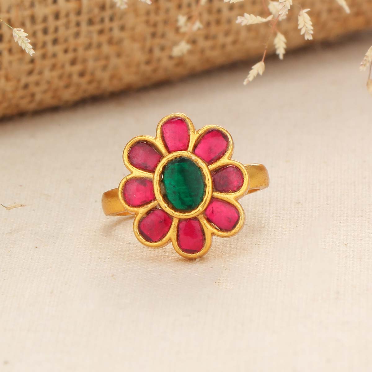 This 92.5 Silver, 24 kt Gold-Plated Ring is adorned with Semi-precious Kundan Stones for a luxurious aesthetic.