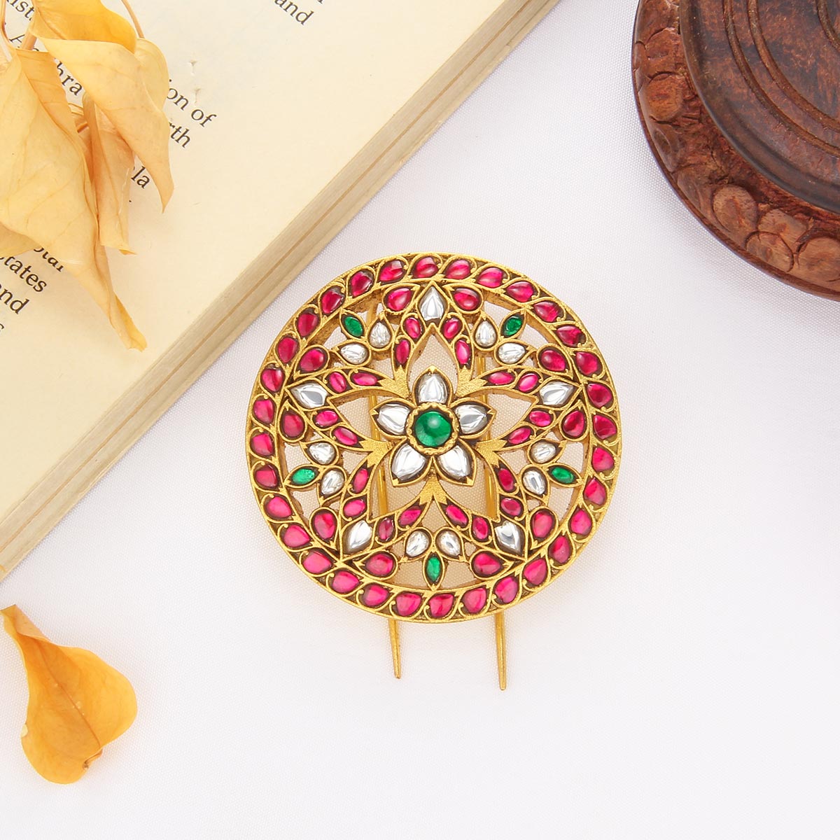 This 92.5 Silver, 24 kt Gold-Plated Jada Billa is adorned with Semi-precious Kundan Stones for a luxurious aesthetic.
