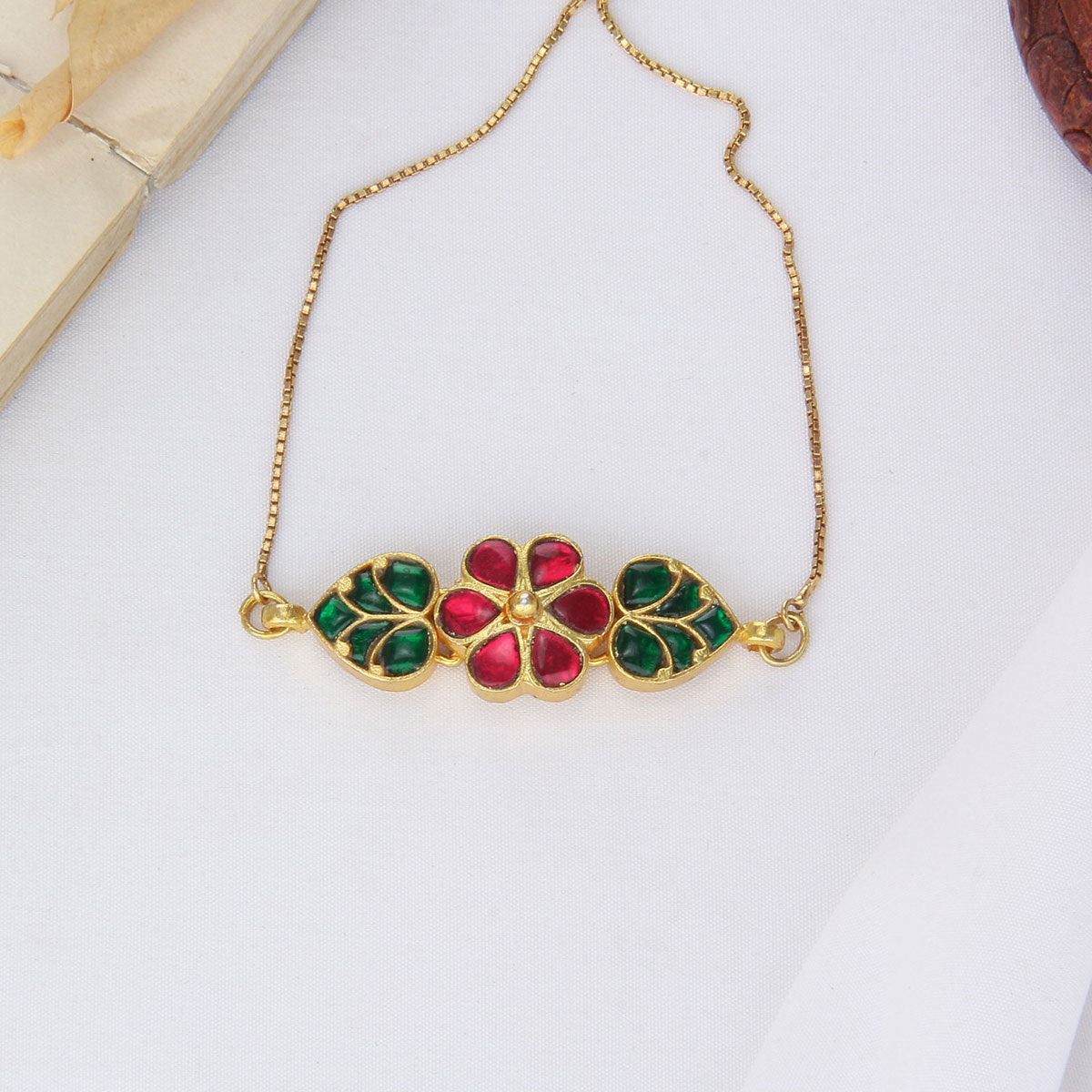 This 92.5 Silver, 24 kt Gold-Plated bracelet is adorned with Semi-precious Kundan Stones for a luxurious aesthetic.