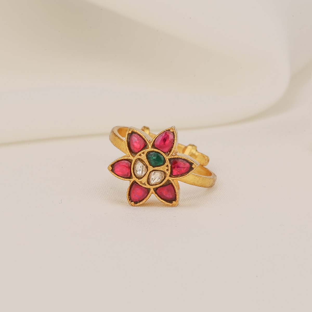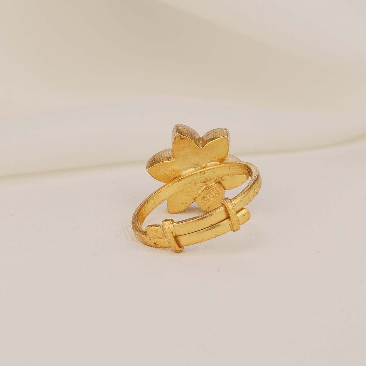 This 92.5 Silver, 24 kt Gold-Plated Ring is adorned with Semi-precious Kundan Stones for a luxurious aesthetic.