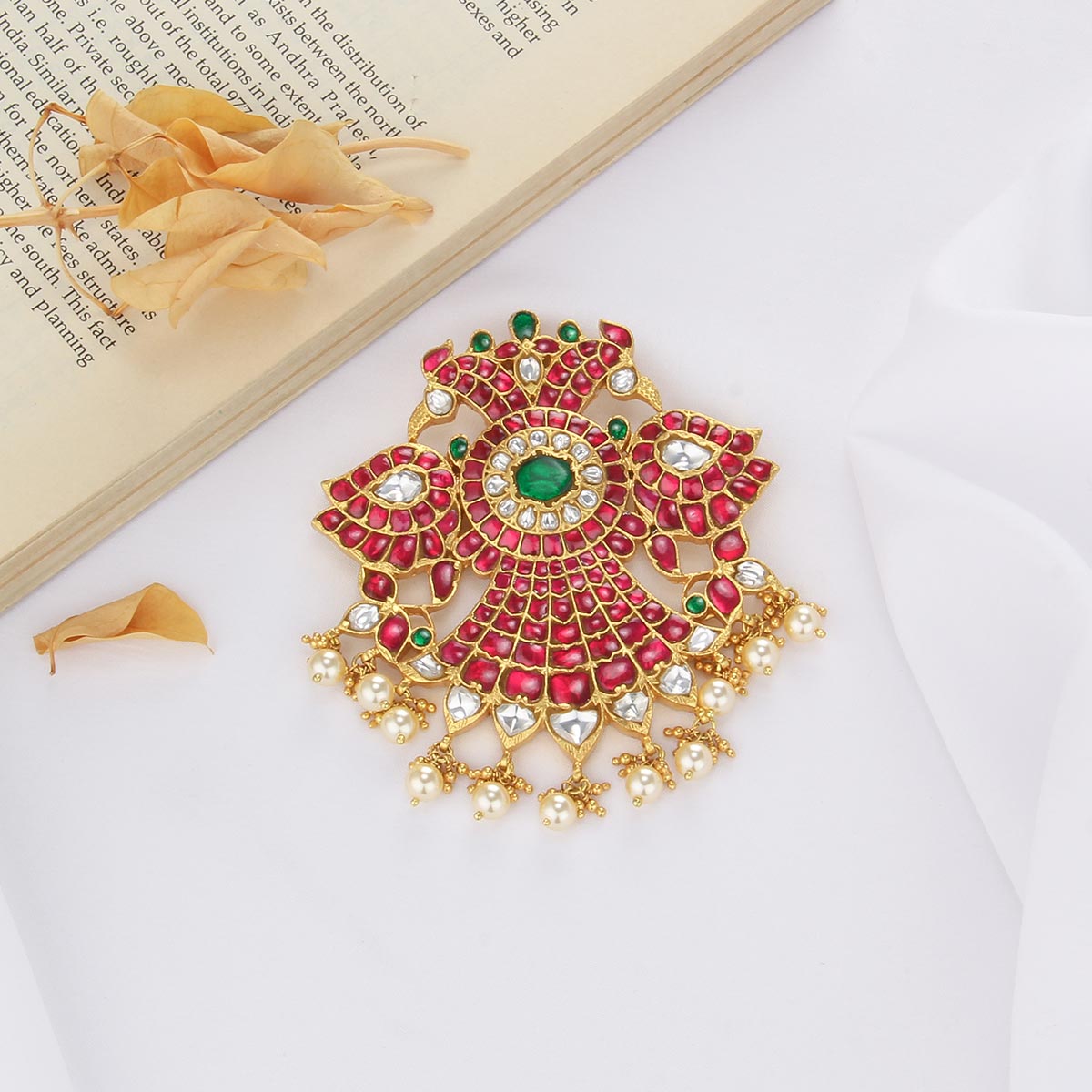 This 92.5 Silver, 24 kt Gold-Plated Pendant is adorned with Semi-precious Kundan Stones for a luxurious aesthetic.