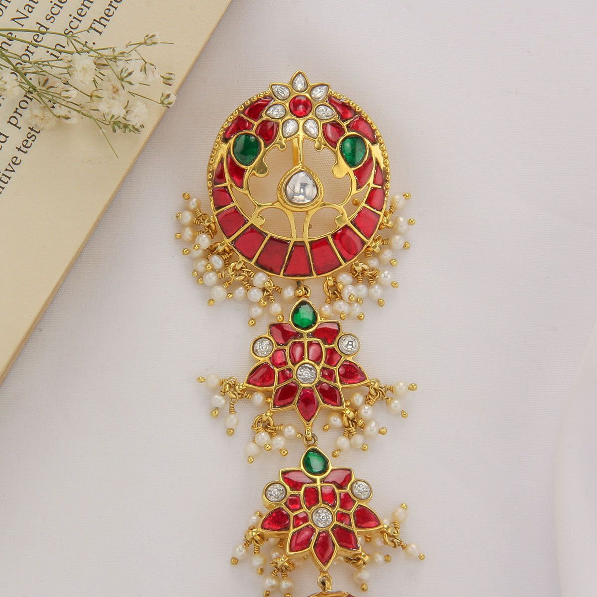 This 92.5 Silver, 24 kt Gold-Plated Jada Billa is adorned with Semi-precious Kundan Stones for a luxurious aesthetic.