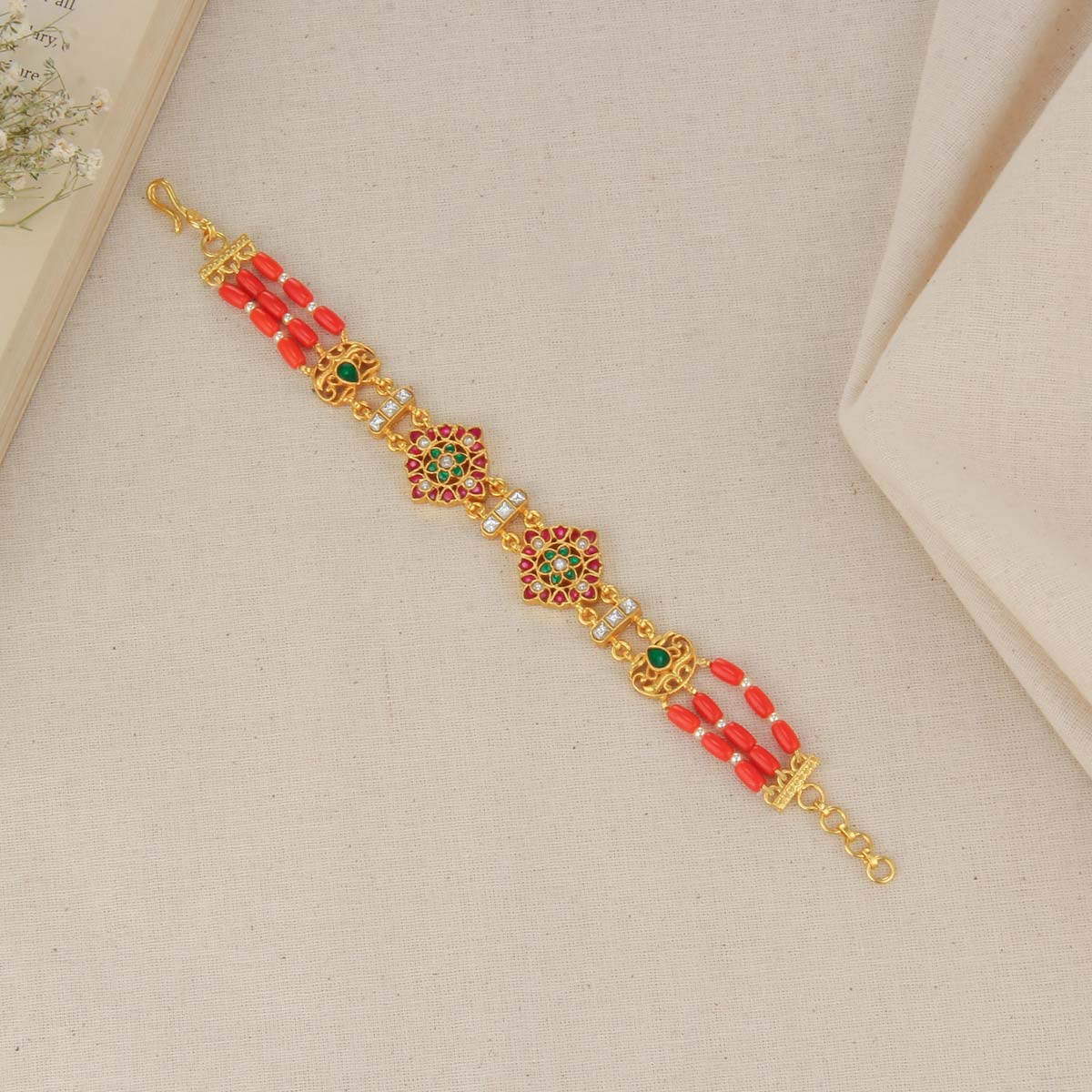 This 92.5 Silver, 24 kt Gold-Plated bracelet is adorned with Semi-precious Kundan Stones for a luxurious aesthetic.