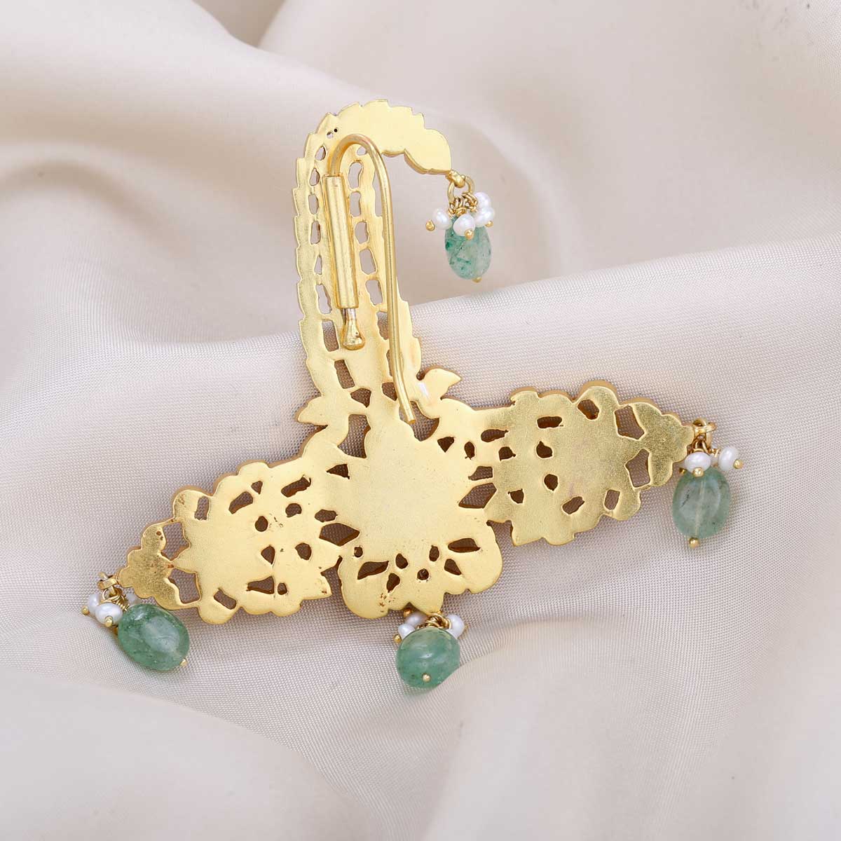 This 92.5 Silver, 24 kt Gold-Plated Jada Billa is adorned with Semi-precious Kundan Stones for a luxurious aesthetic.