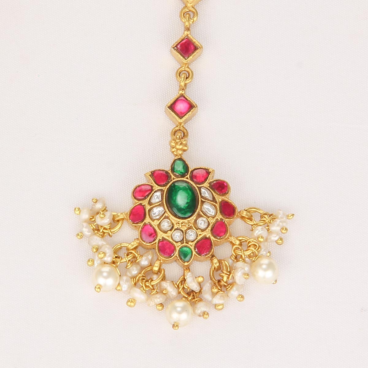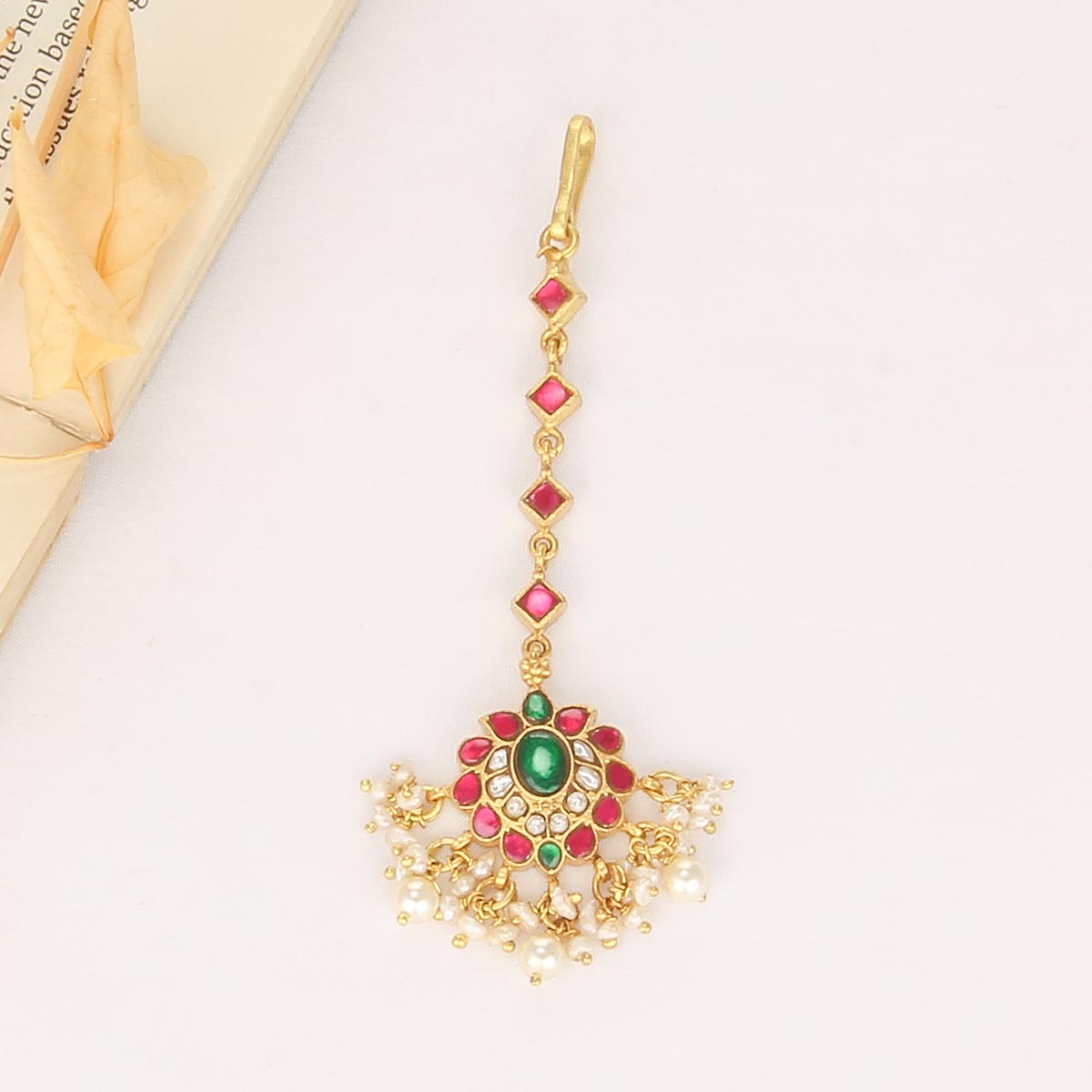This 92.5 Silver, 24 kt Gold-Plated Maangtikka is adorned with Semi-precious Kundan Stones for a luxurious aesthetic.
