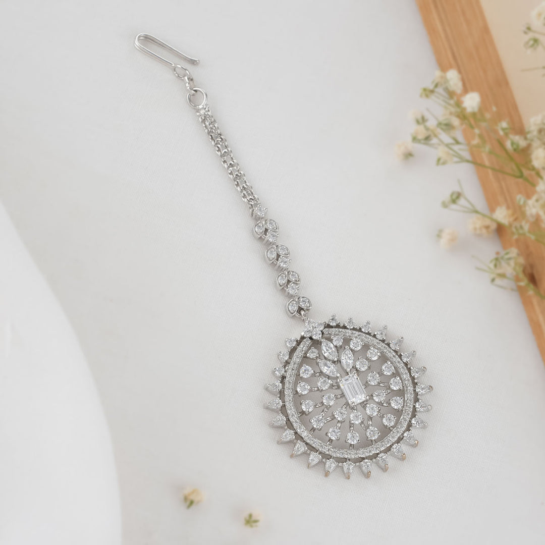 This sophisticated Maangtikka is a perfect accessory to complete your look. Made with 92.5 sterling silver, it is studded with Swarovski cubic zirconia crystals and crafted with great care and attention to detailan ideal choice for a special occasion.