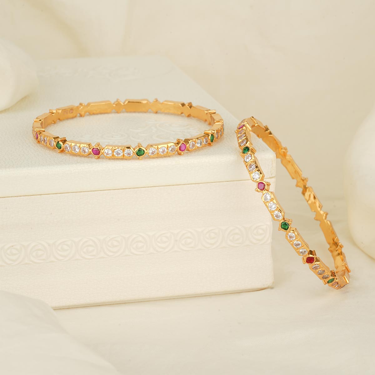 This 92.5 Silver, 24 kt gold-plated stylish Bangles is studded with semi-precious stones to make a stunning statement. Perfect for both formal and casual occasions.