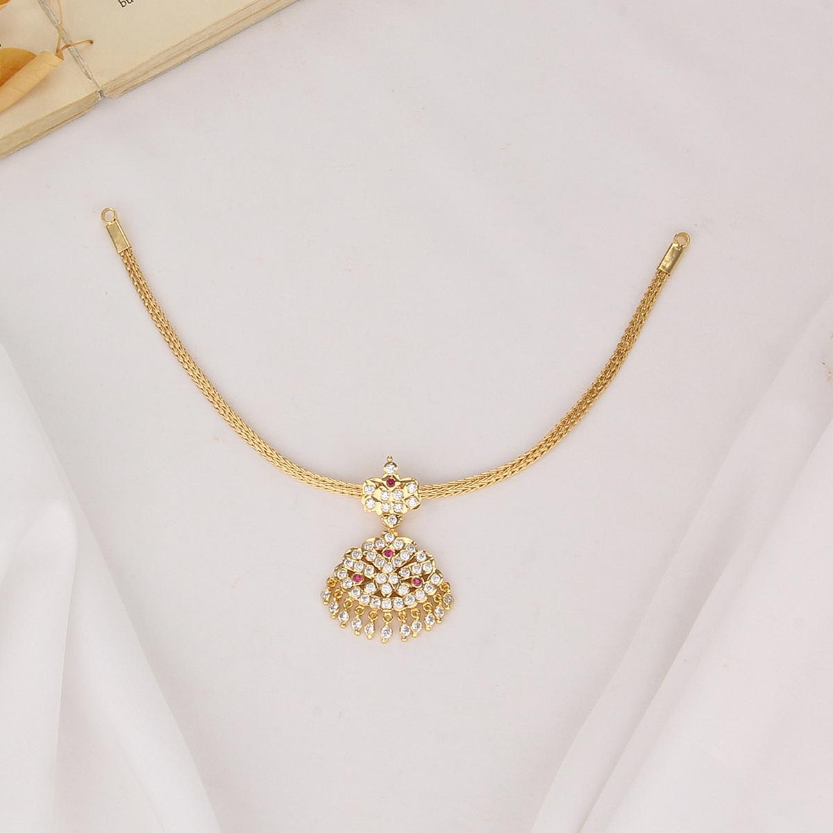 This 92.5 Silver, 24 kt gold-plated, This Attigai Necklace is studded with semi-precious stones to make a stunning statement.