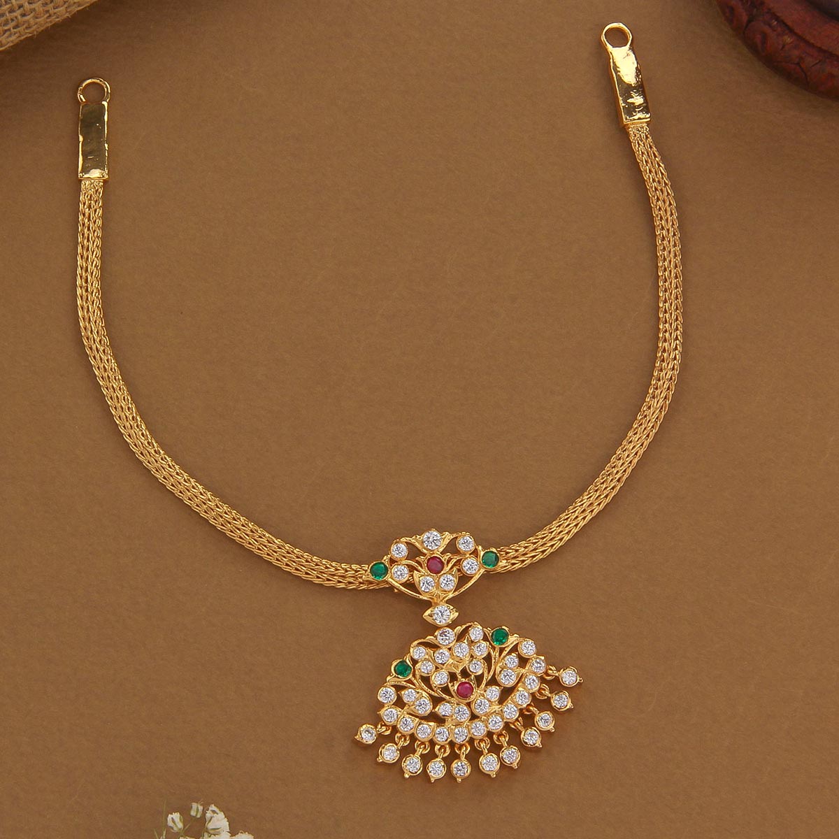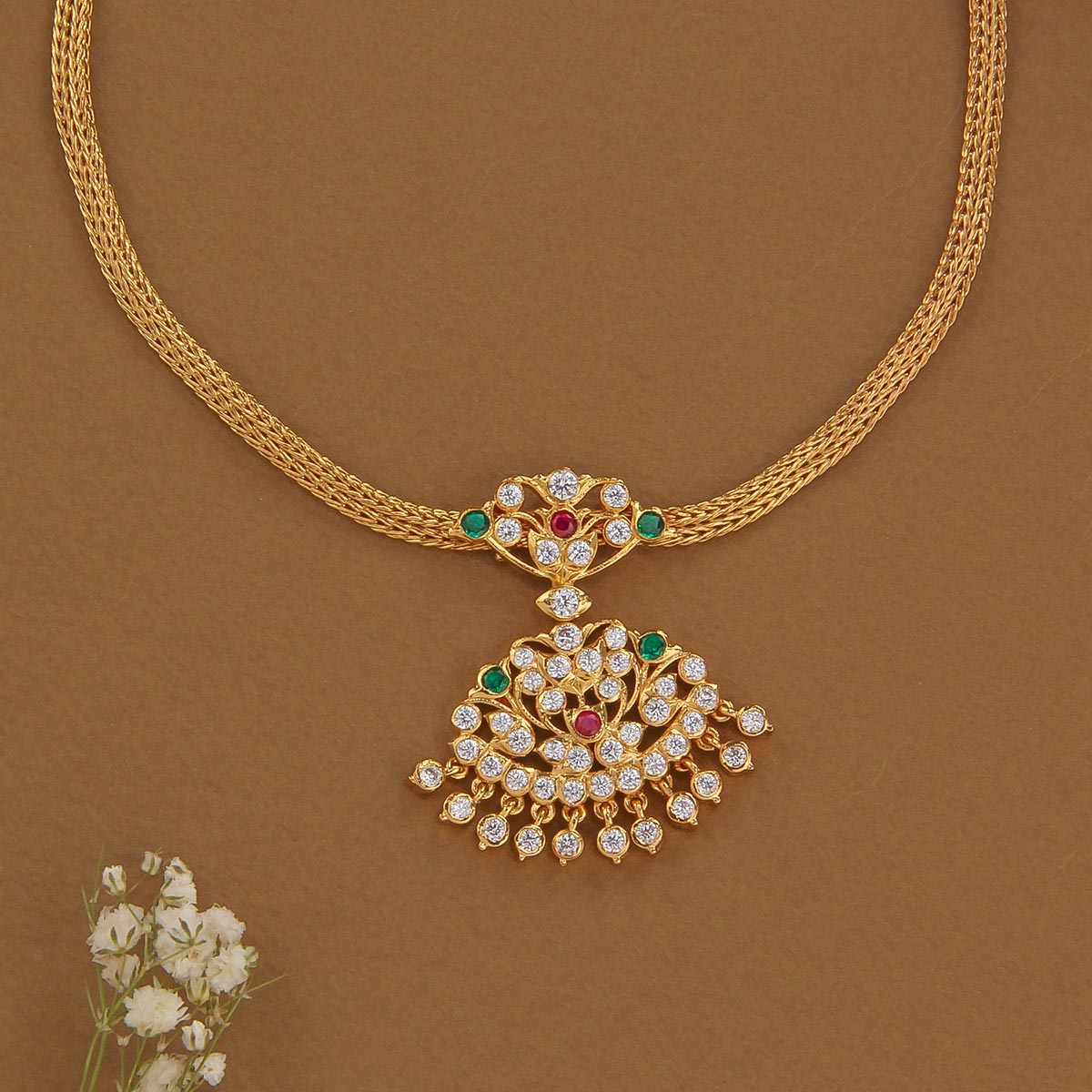 This 92.5 Silver, 24 kt gold-plated, stylish Necklace is studded with semi-precious stones to make a stunning statement. Perfect for any special occasion.