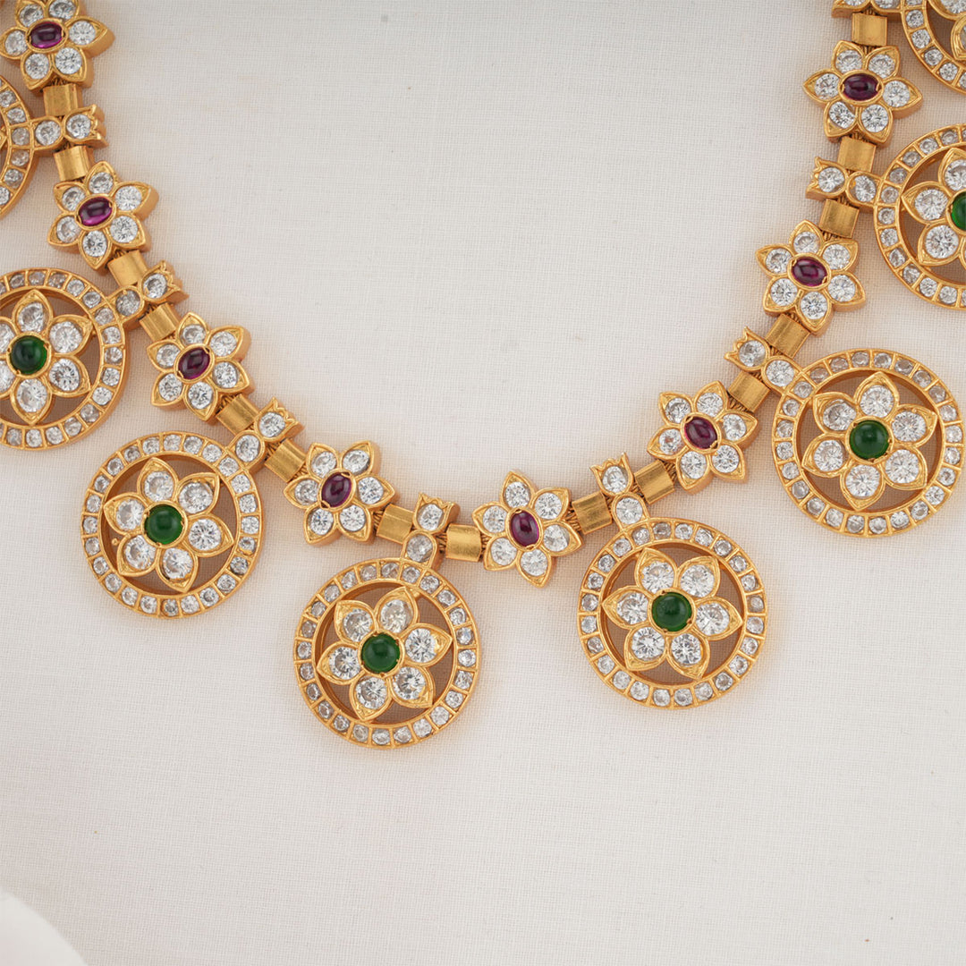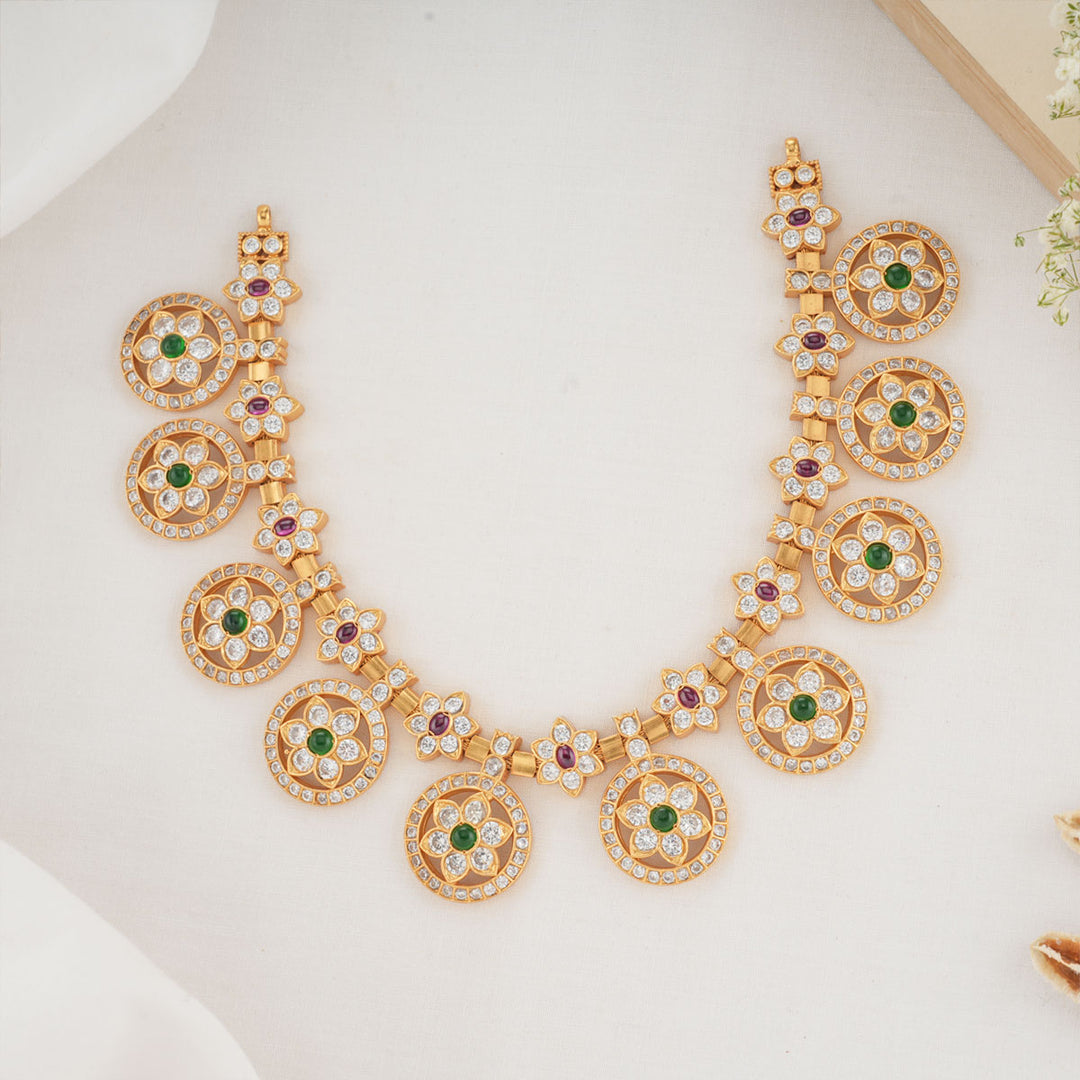 This 92.5 Silver, 24 kt gold-plated stylish Necklace is studded with semi-precious stones to make a stunning statement. Perfect for any special occasion.