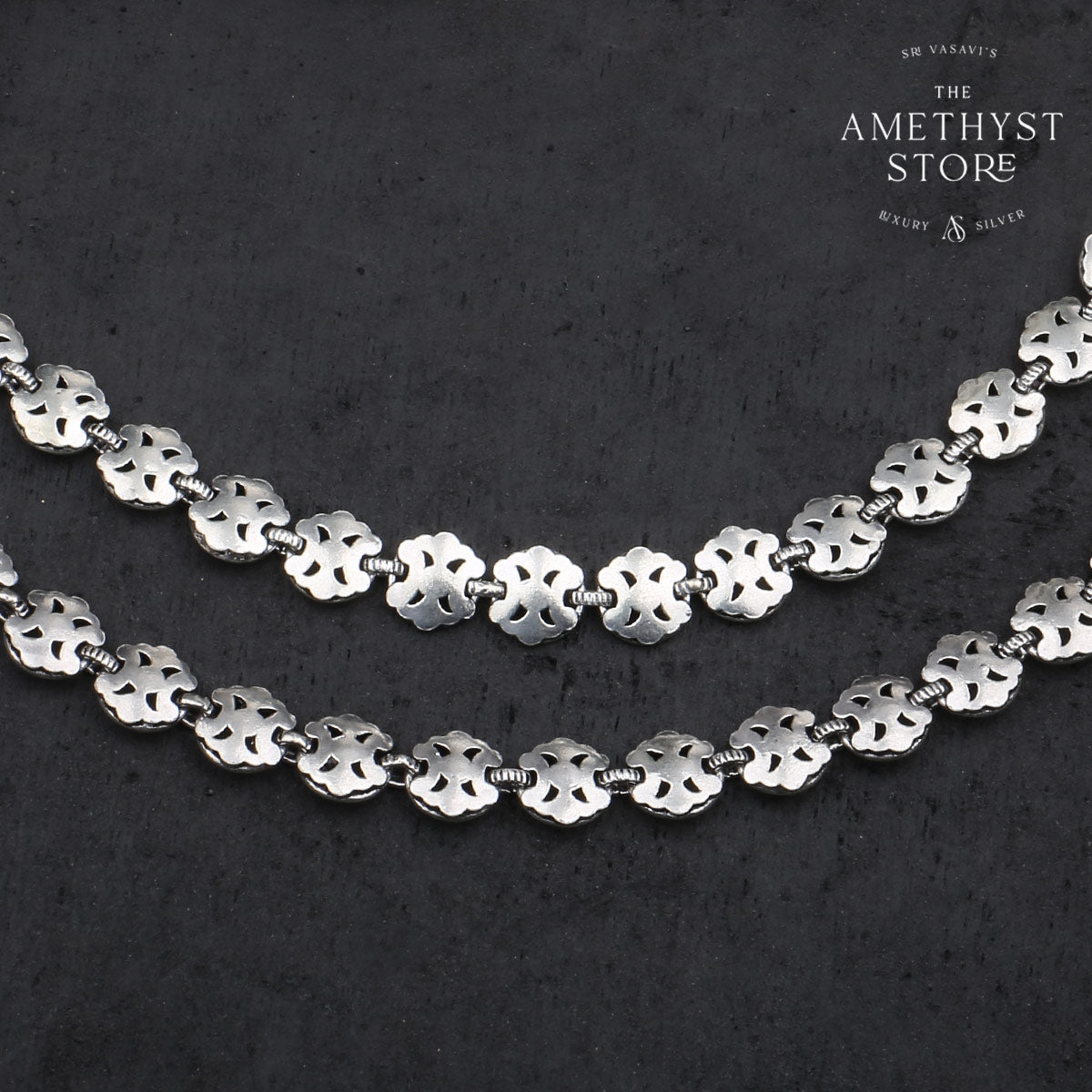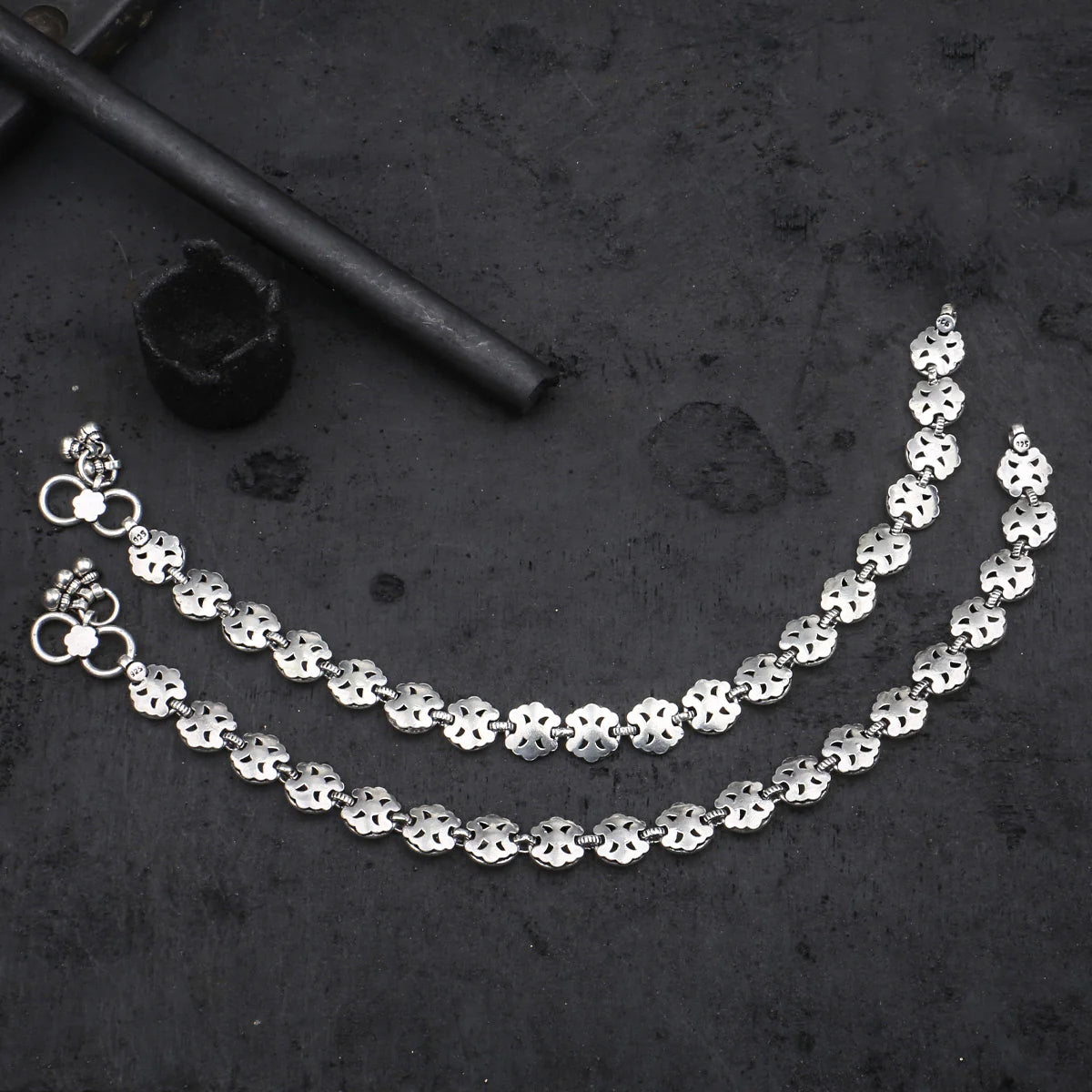 Handcrafted sterling silver (92.5%) anklets with an intricate design this pair has been oxidized. Crafted in a simple and no-fuss design, this pair of anklets is great for everyday wear.