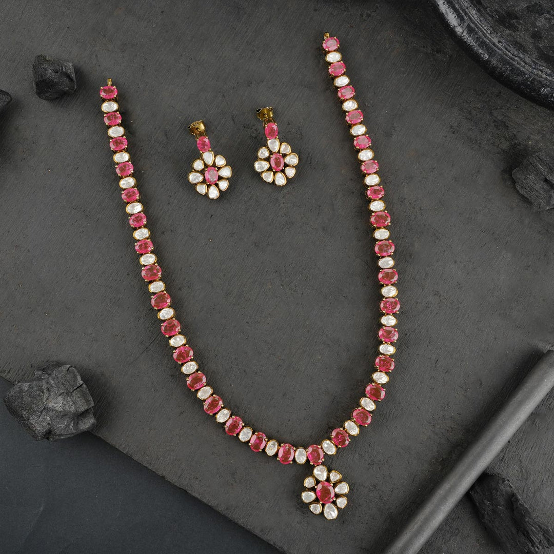 92.5 Silver, Victorian Necklace set studded with pink Sapphire lookalike gemstones.