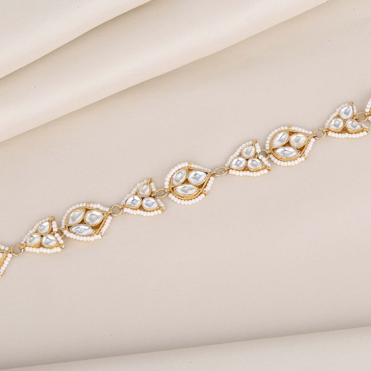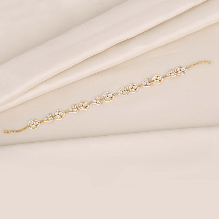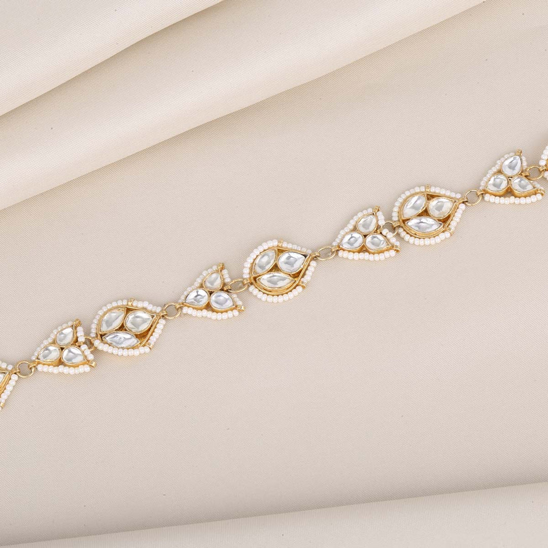 This 92.5 Silver, 24 kt Gold-Plated Sheeshphool is adorned with Semi-precious Kundan Stones for a luxurious aesthetic.