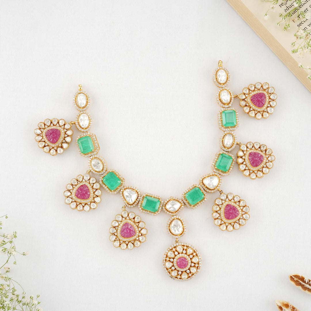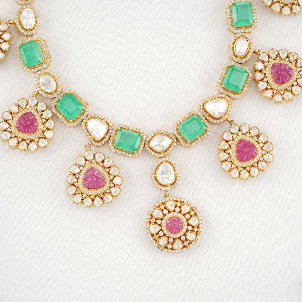 This necklace is crafted from 92.5 Sterling Silver and features 24-karat gold plating as well as semiprecious stones.