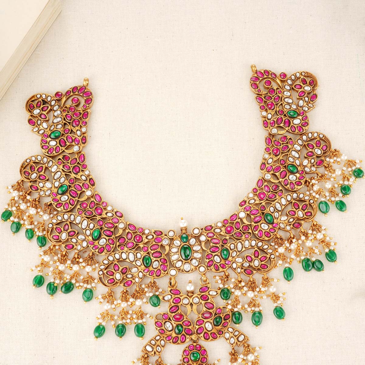 This 92.5 Silver, 24 kt Gold-Plated Necklace is adorned with Semi-precious Kundan Stones for a luxurious aesthetic.