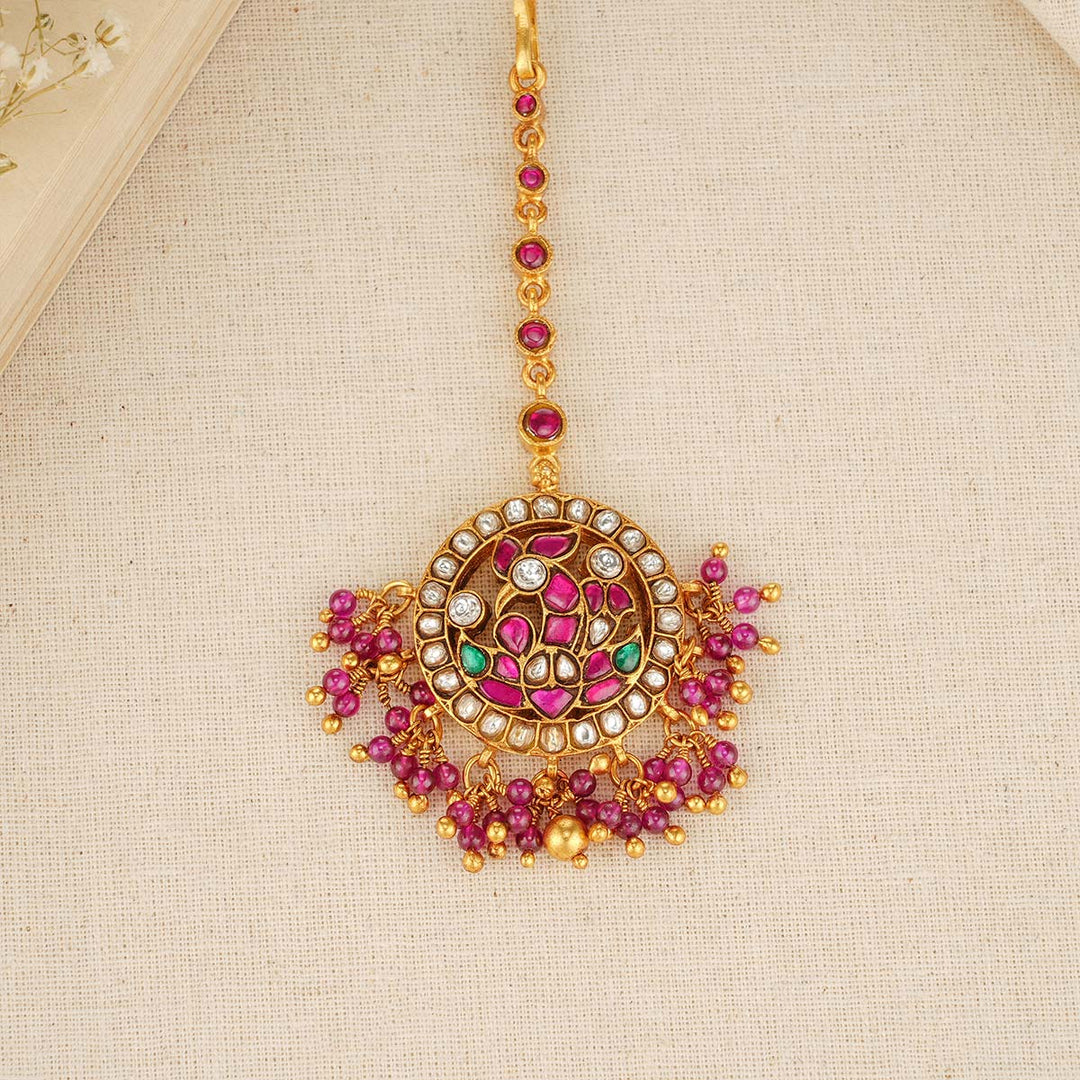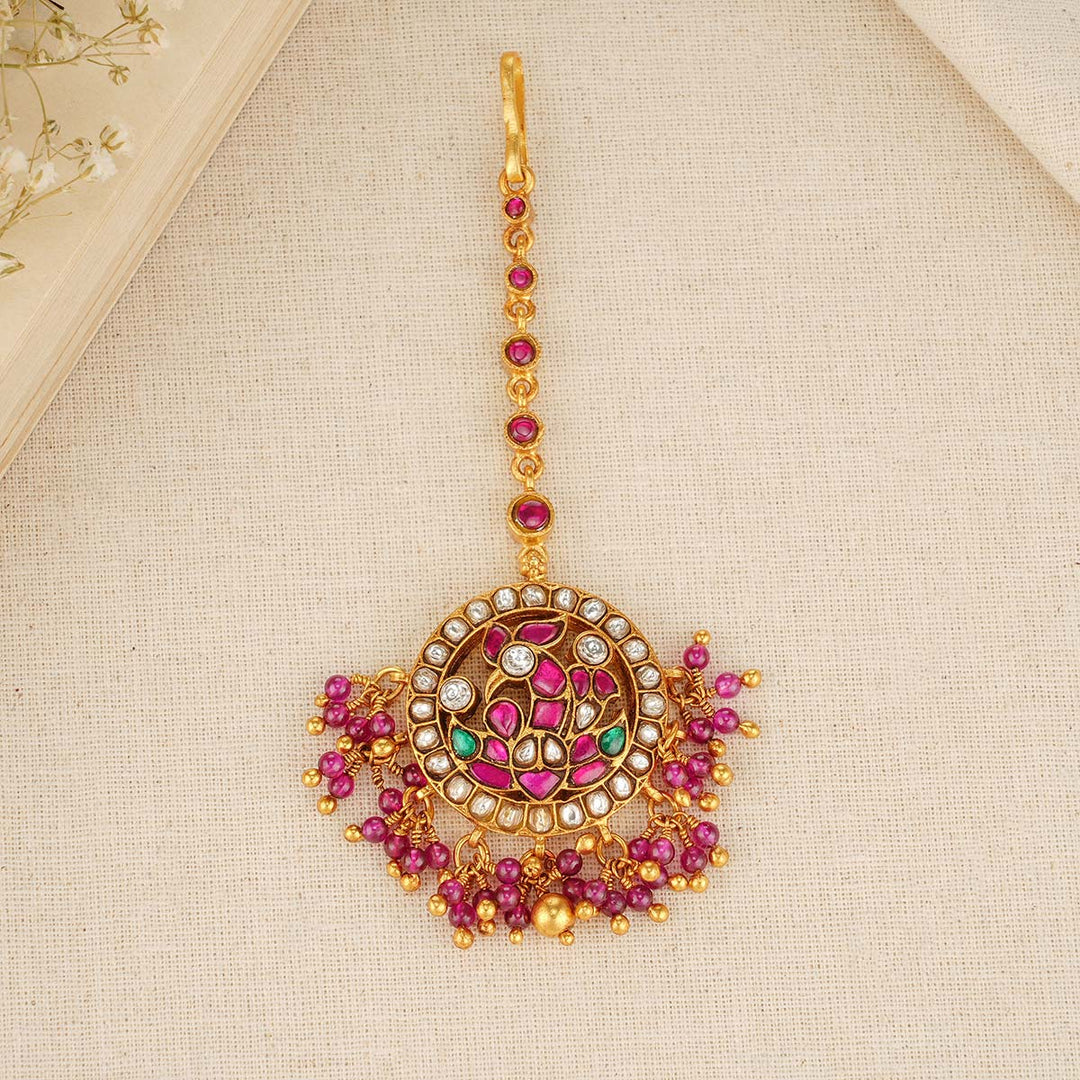 This 92.5 Silver, 24 kt Gold-Plated Maangtikka is adorned with Semi-precious Kundan Stones for a luxurious aesthetic.
