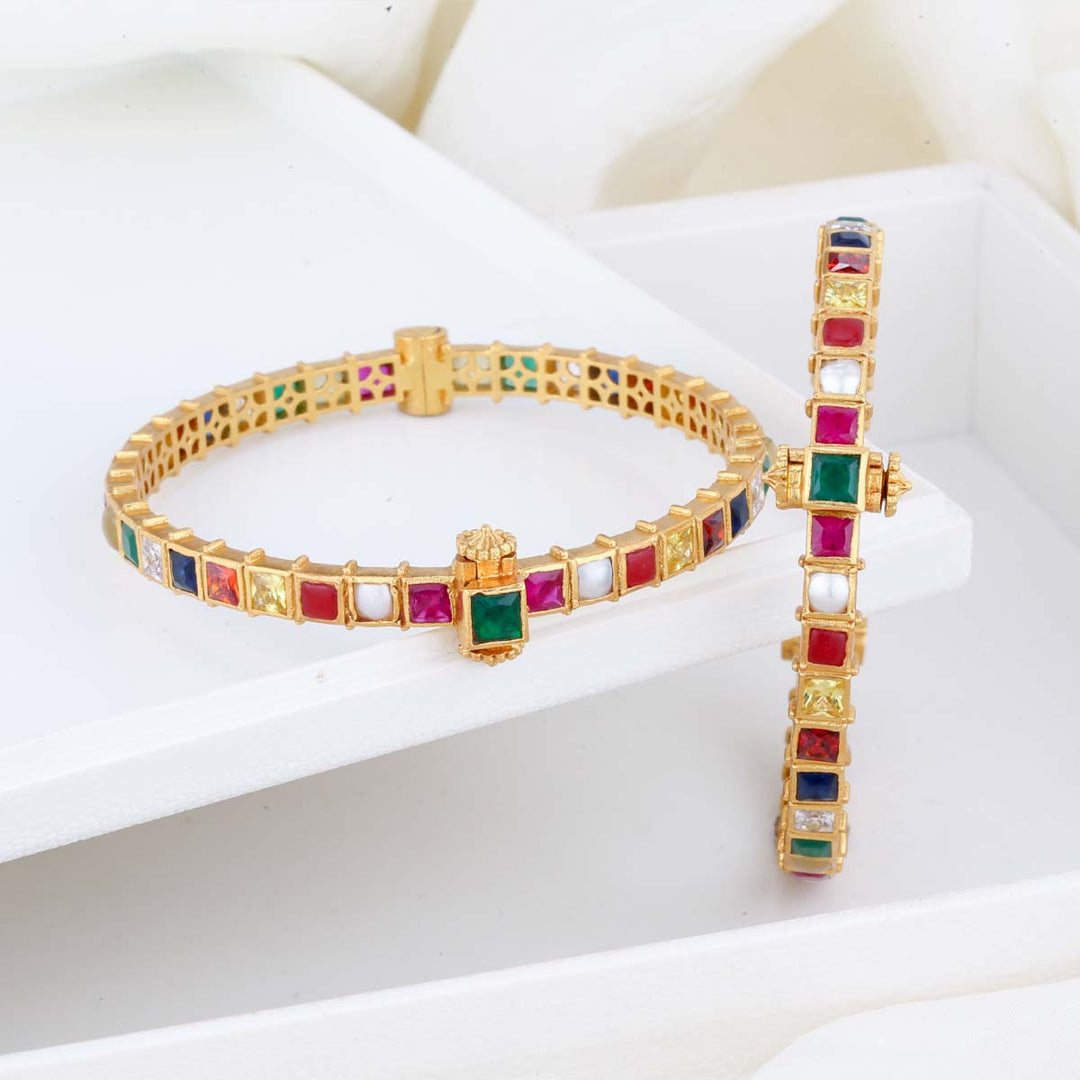 This 92.5 Silver, 24 kt gold-plated stylish Bangles is studded with semi-precious stones to make a stunning statement. Perfect for both formal and casual occasions.