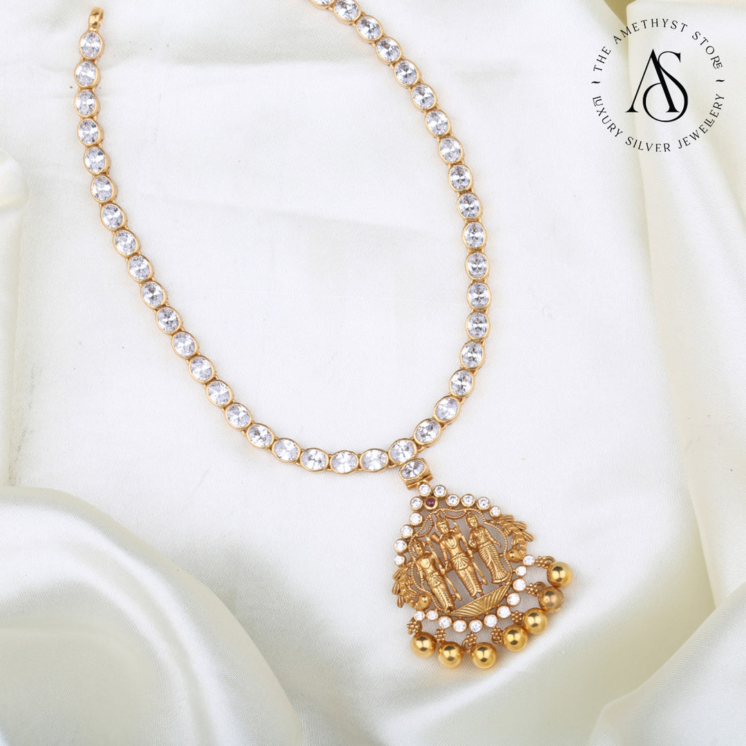This 92.5 Silver, 24 kt gold-plated stylish Necklace is studded with semi-precious stones to make a stunning statement. Perfect for any special occasion.