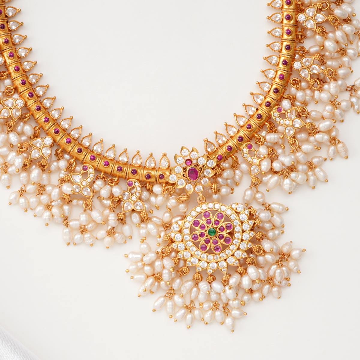 This 92.5 Silver, 24 kt gold-plated stylish Necklace is studded with semi-precious stones to make a stunning statement. Perfect for any special occasion.