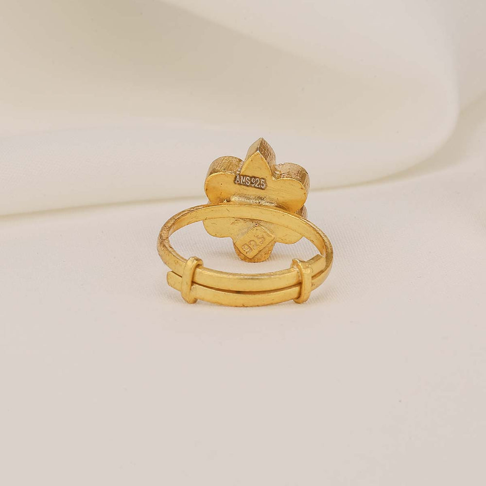This 92.5 Silver, 24 kt Gold-Plated Ring is adorned with Semi-precious Kundan Stones for a luxurious aesthetic.