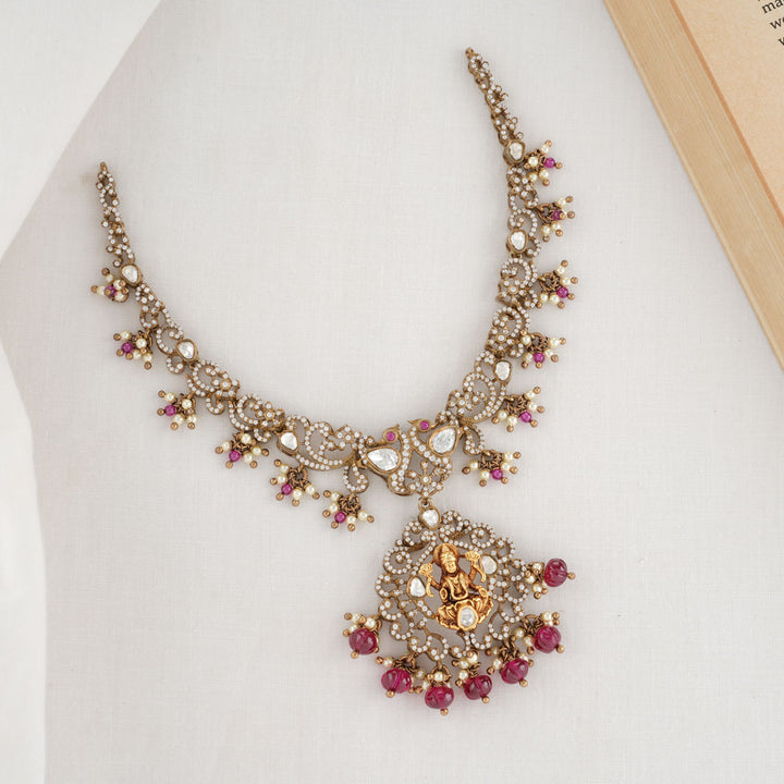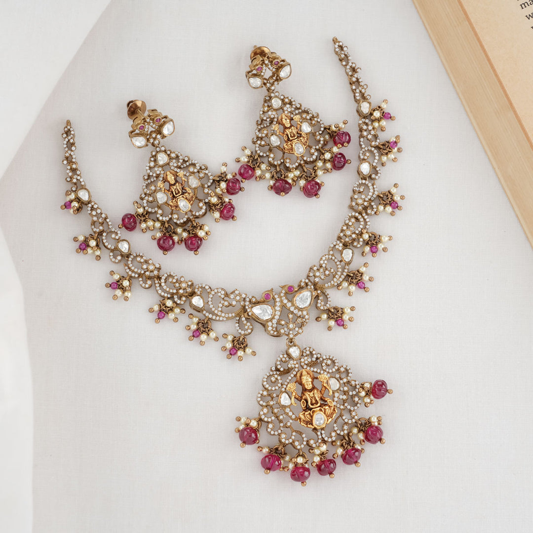 92.5 Silver, Victorian Necklace set studded with Gem Stones and Pearl Beads.