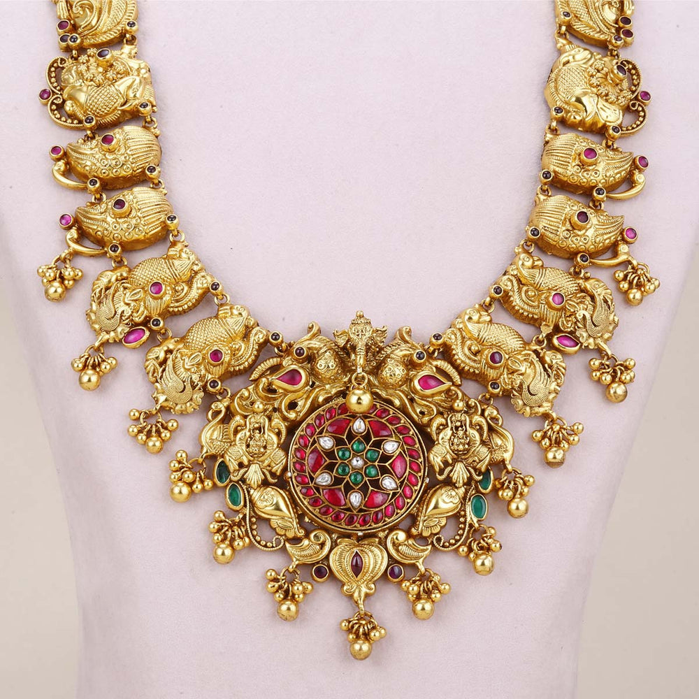 This necklace is constructed with 92.5 sterling silver and 24kt gold plating, featuring semi-precious stones for a luxurious finish.