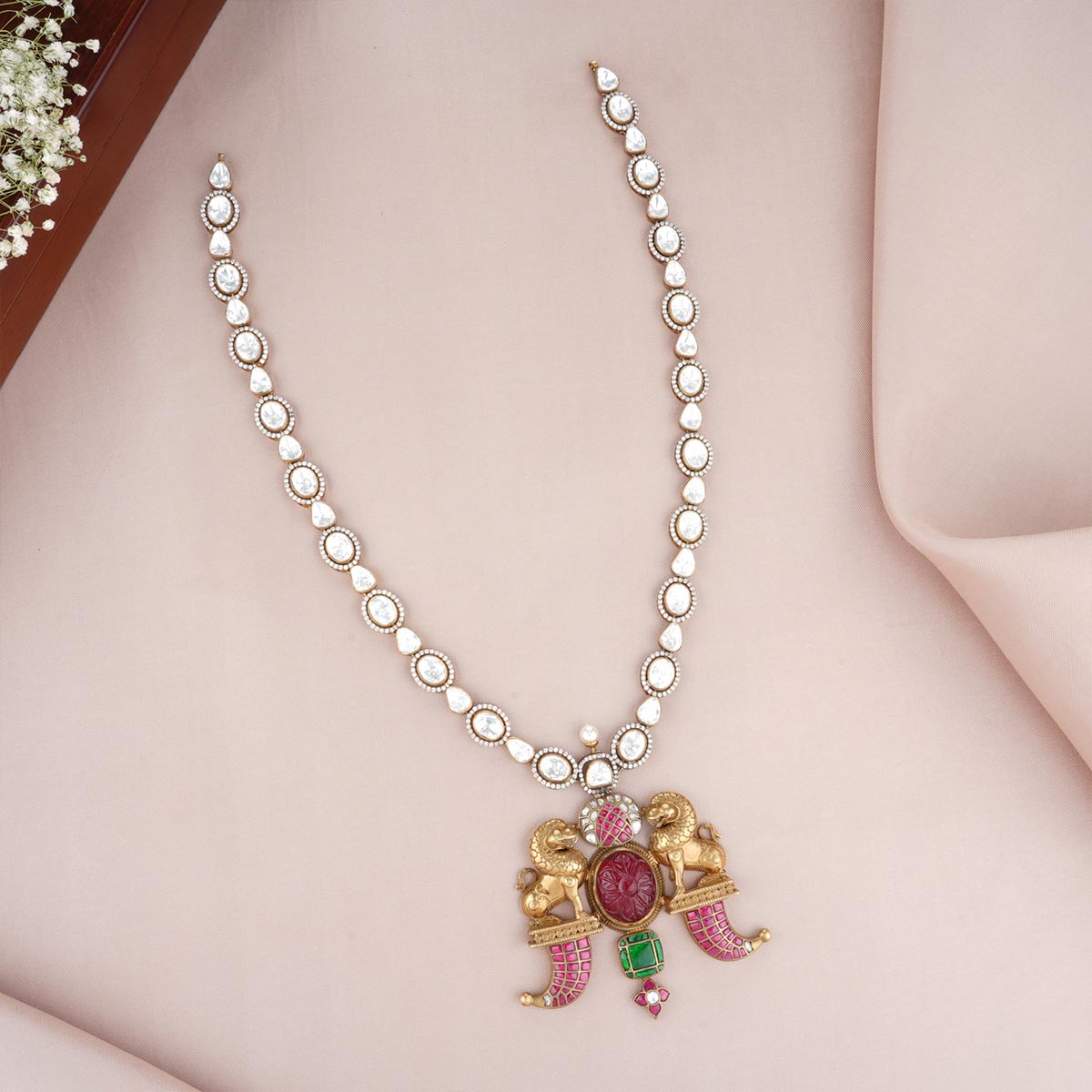 92.5 Silver, Victorian Necklace studded with Gem Stones and Pearl Beads.
