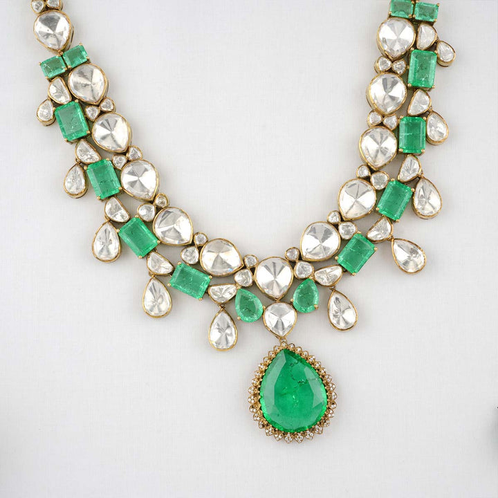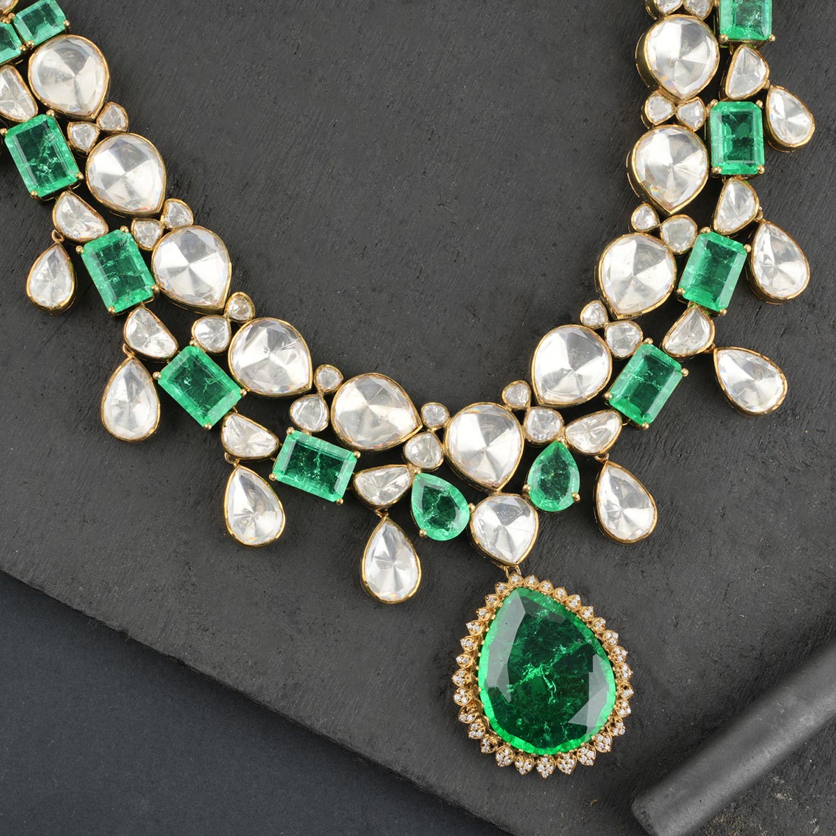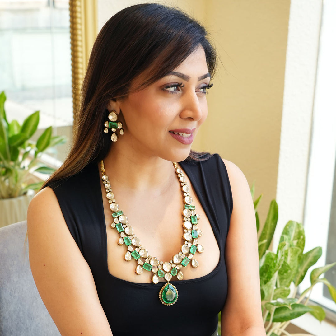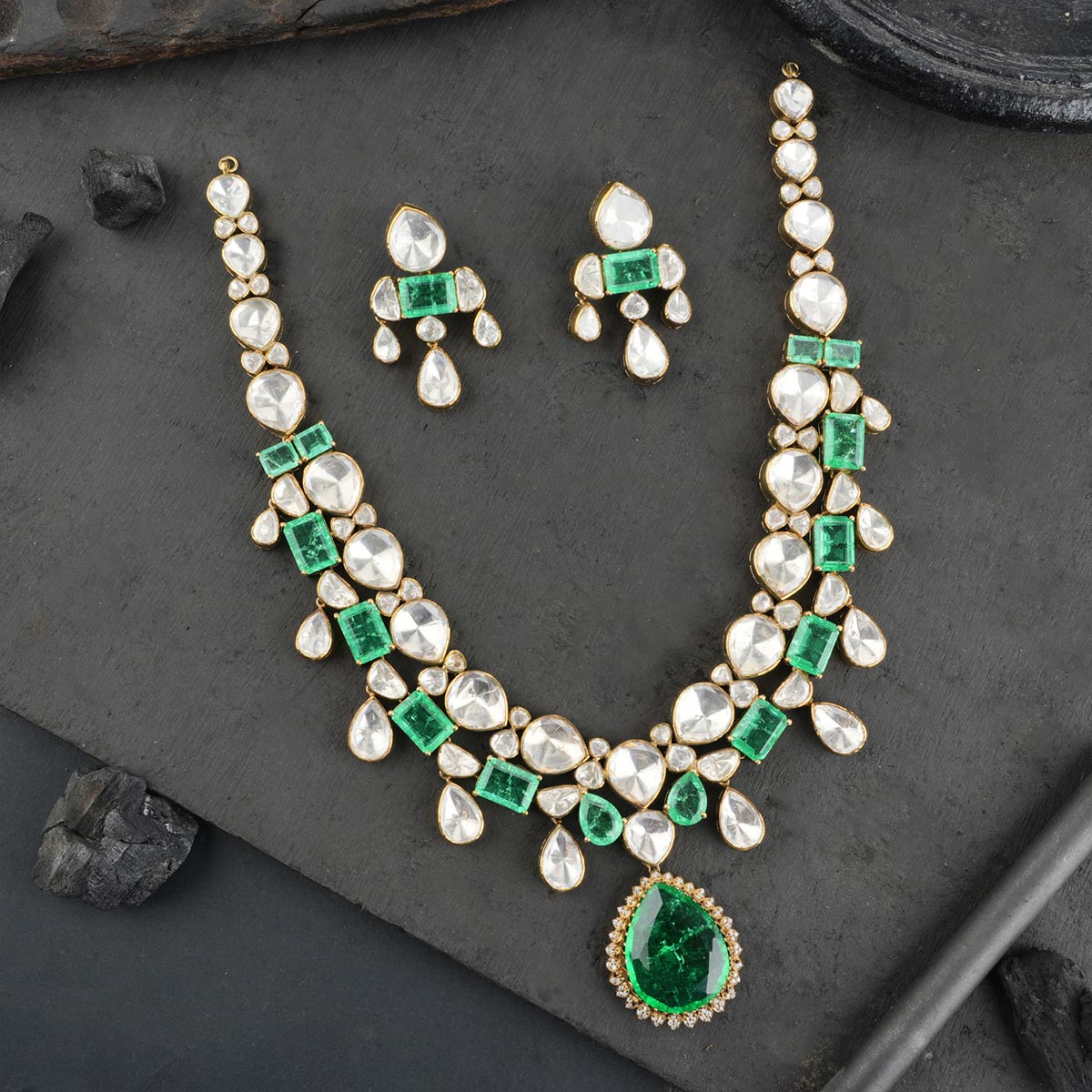 92.5 Silver, Victorian Necklace set studded with emerald lookalike gemstones.