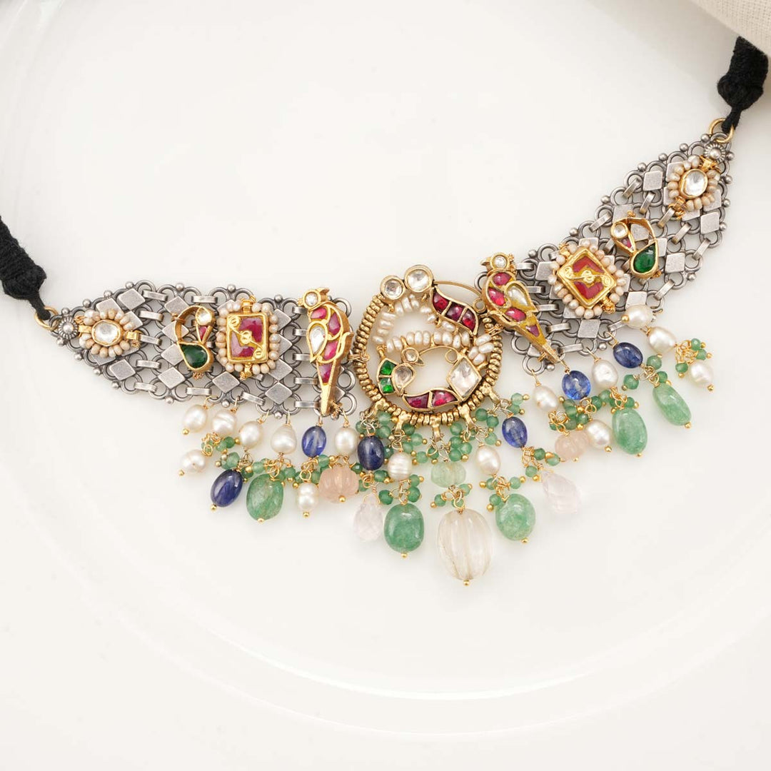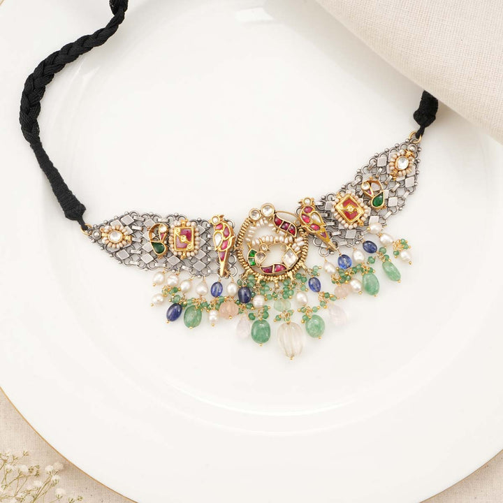 This 92.5 Silver, 24 kt Gold-Plated Choker is adorned with Semi-precious Kundan Stones for a luxurious aesthetic.