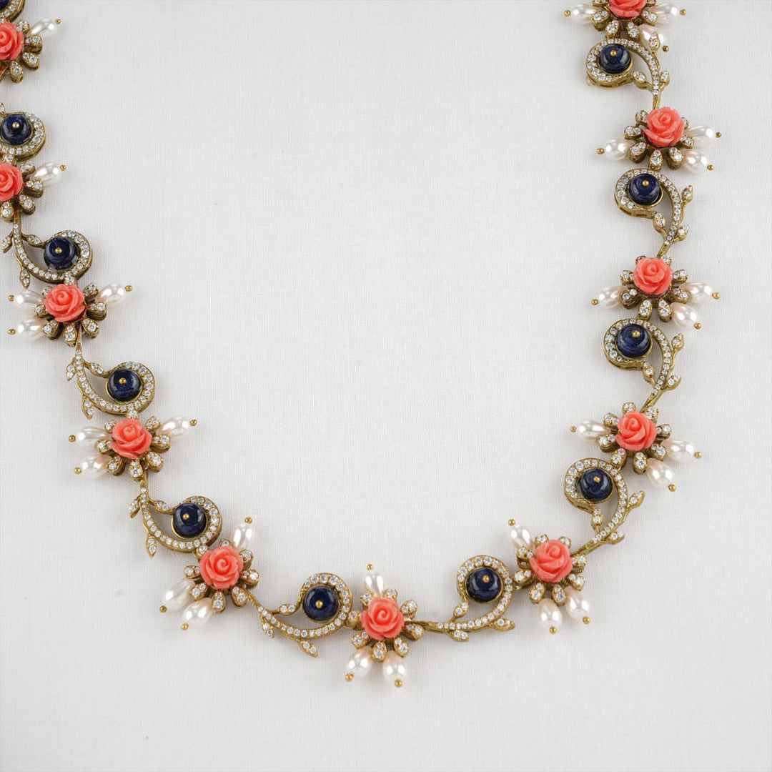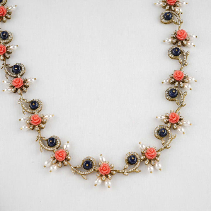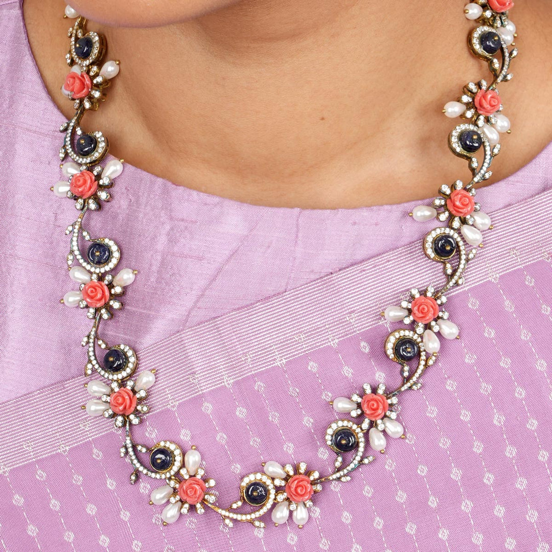 92.5 Silver, Victorian Necklace set studded with Gem Stones and Pearl Beads.