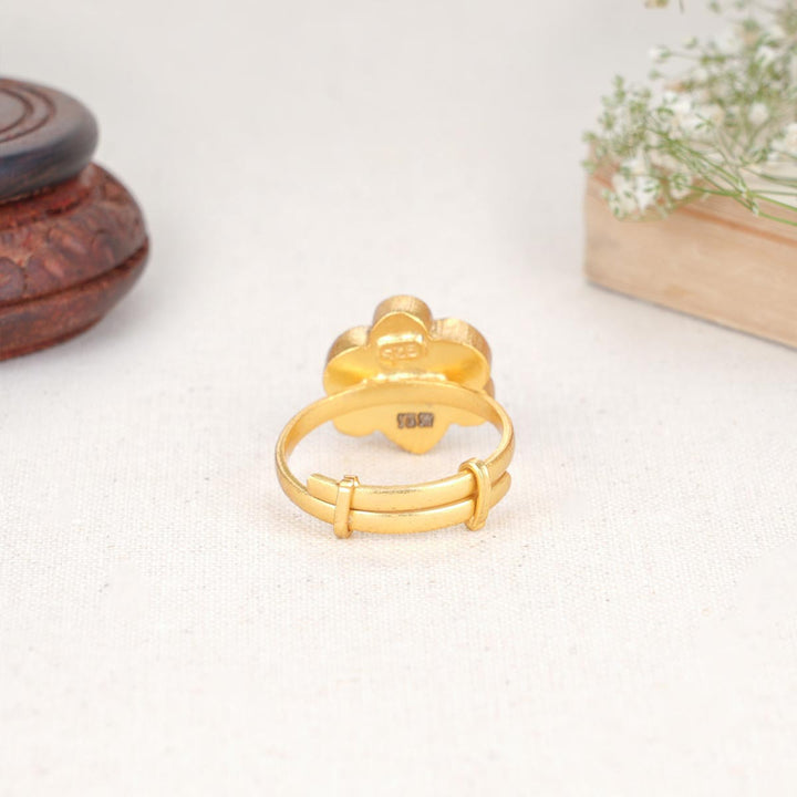 This 92.5 Silver, 24 kt Gold-Plated Ring is adorned with Semi-precious Kundan Stones for a luxurious aesthetic.