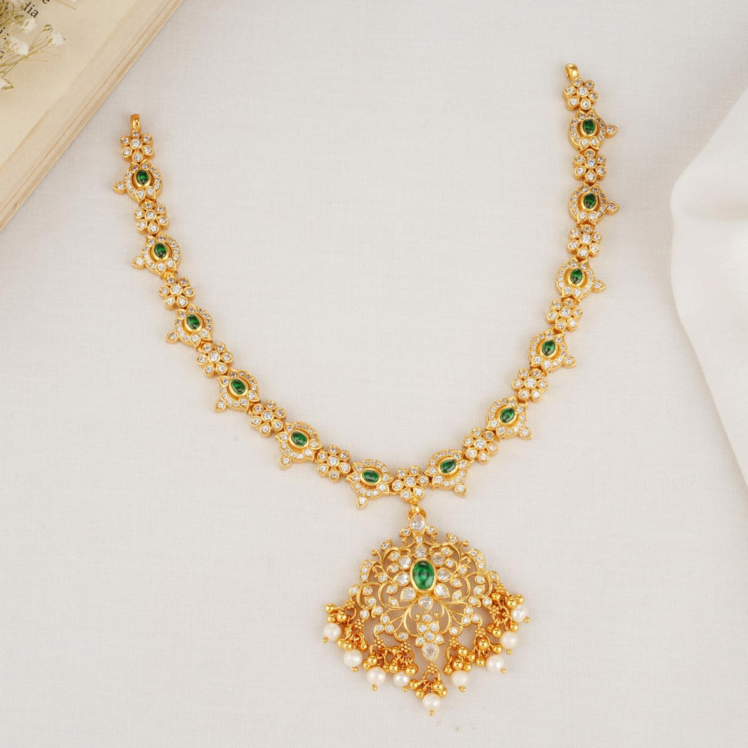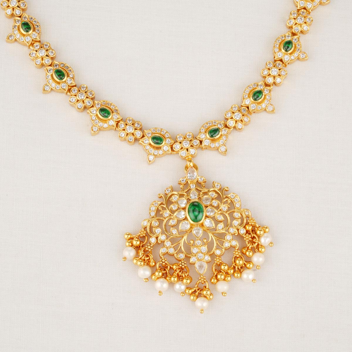 This necklace is crafted from 92.5 Sterling Silver and features 24-karat gold plating as well as semiprecious stones.