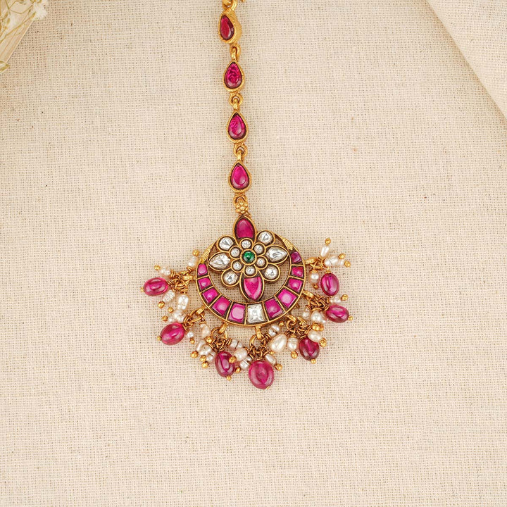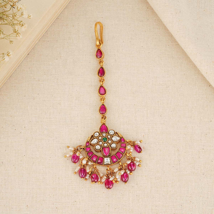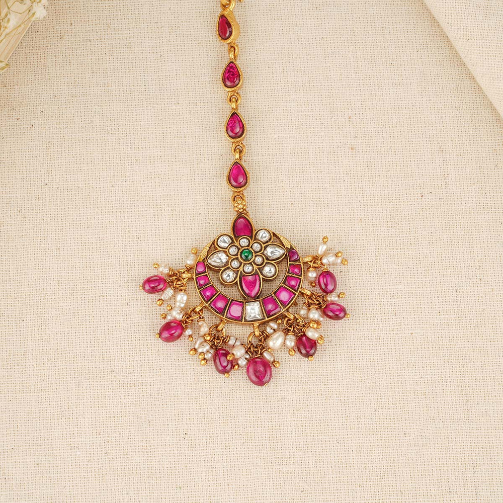 This 92.5 Silver, 24 kt Gold-Plated Maangtikka is adorned with Semi-precious Kundan Stones for a luxurious aesthetic.