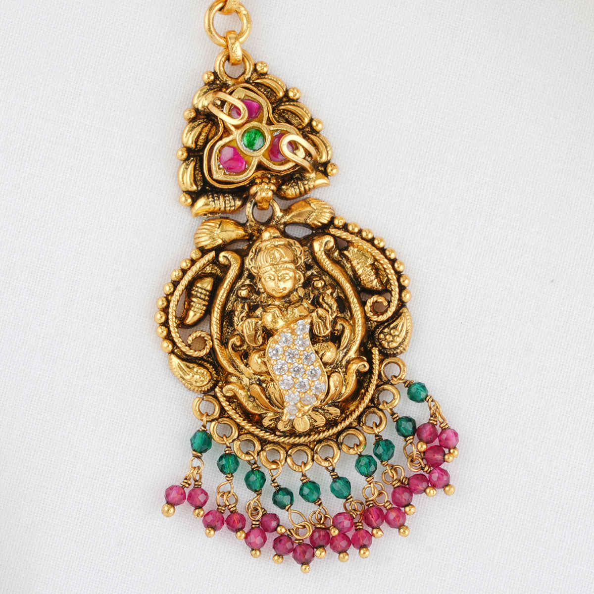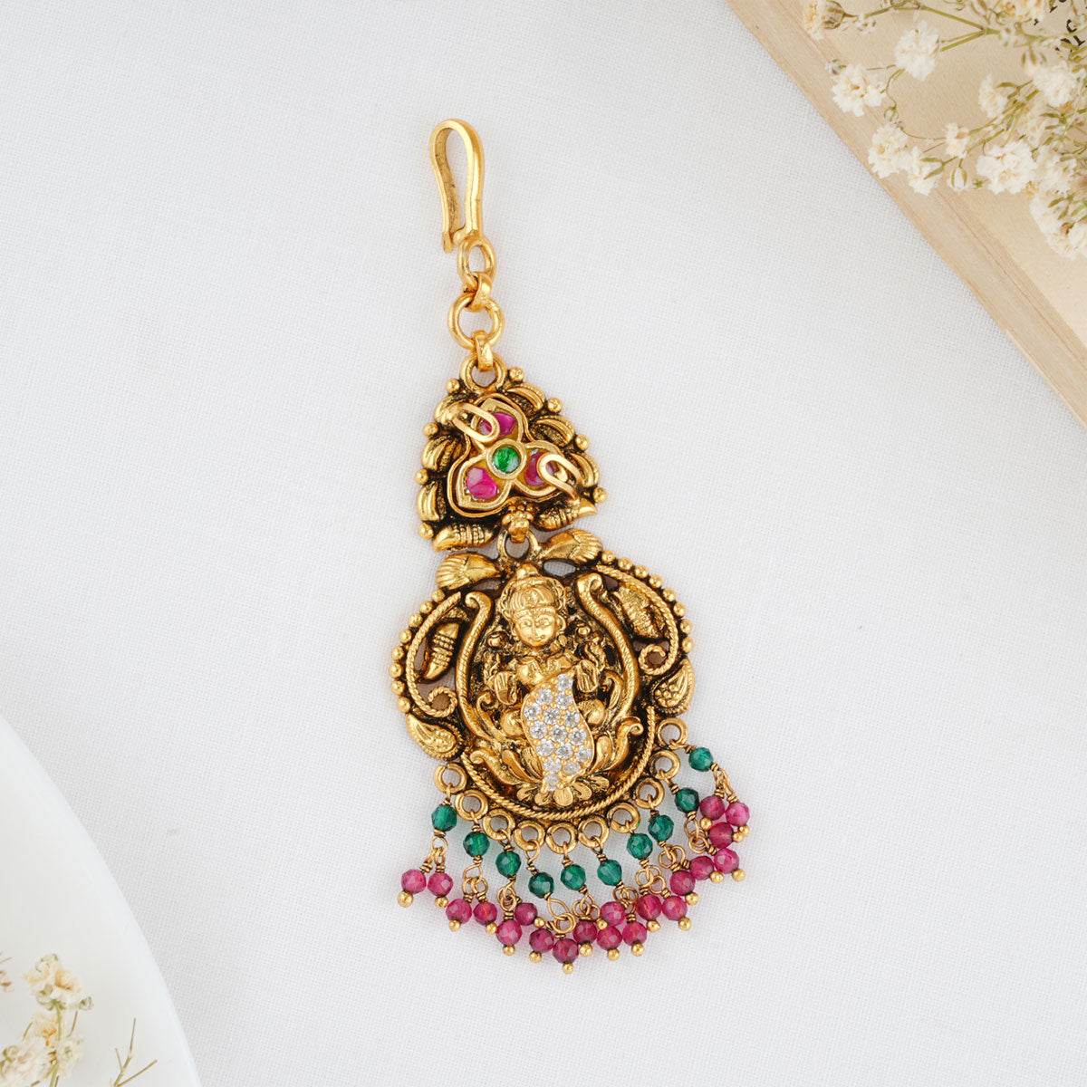 This exquisite Maangtikka will add a glamorous flair to your look. Crafted from 92.5 silver and 24kt gold-plated, it features semi-precious stones for a brilliant shine. Elevate your look with this luxurious Maangtikka.