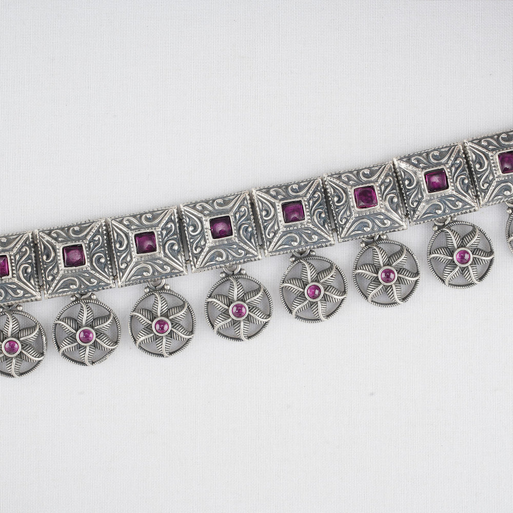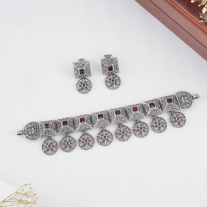 This beautiful Choker set is perfect for any occasion. Crafted from 92.5 sterling silver and oxidized for a unique look, these pretty chokers are studded with semi-precious stones for added sparkle.