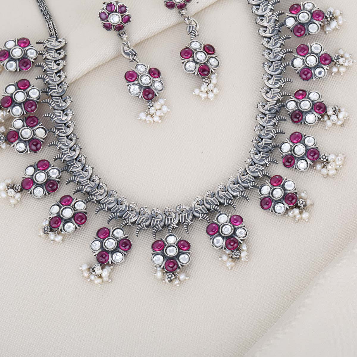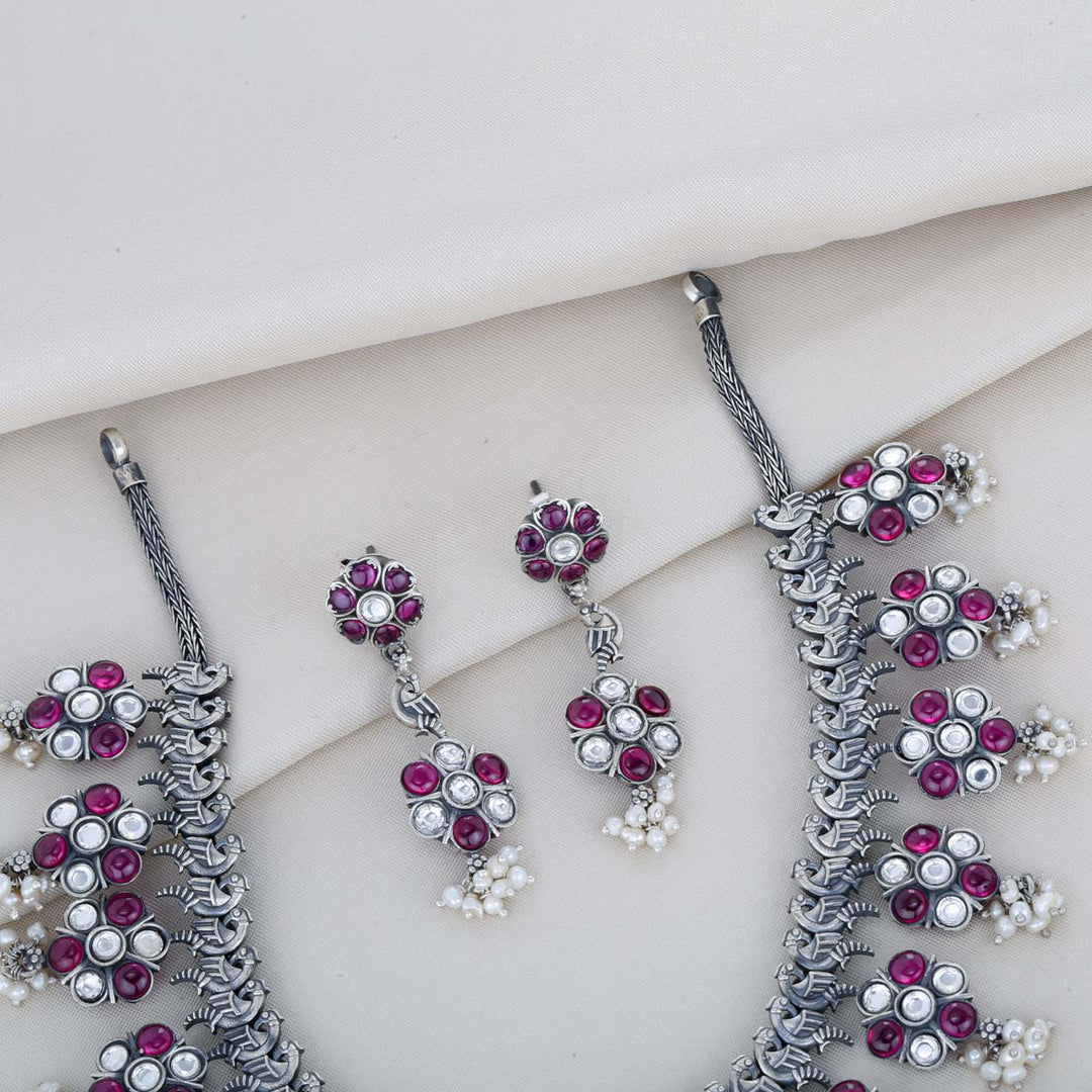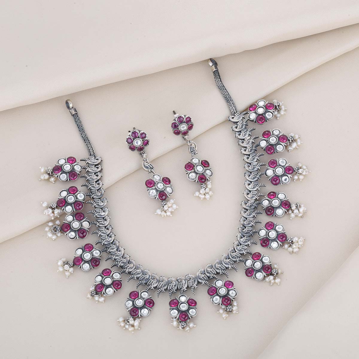 92.5 silver oxidized Necklace Set, Studded with Semi-Precious Stones.