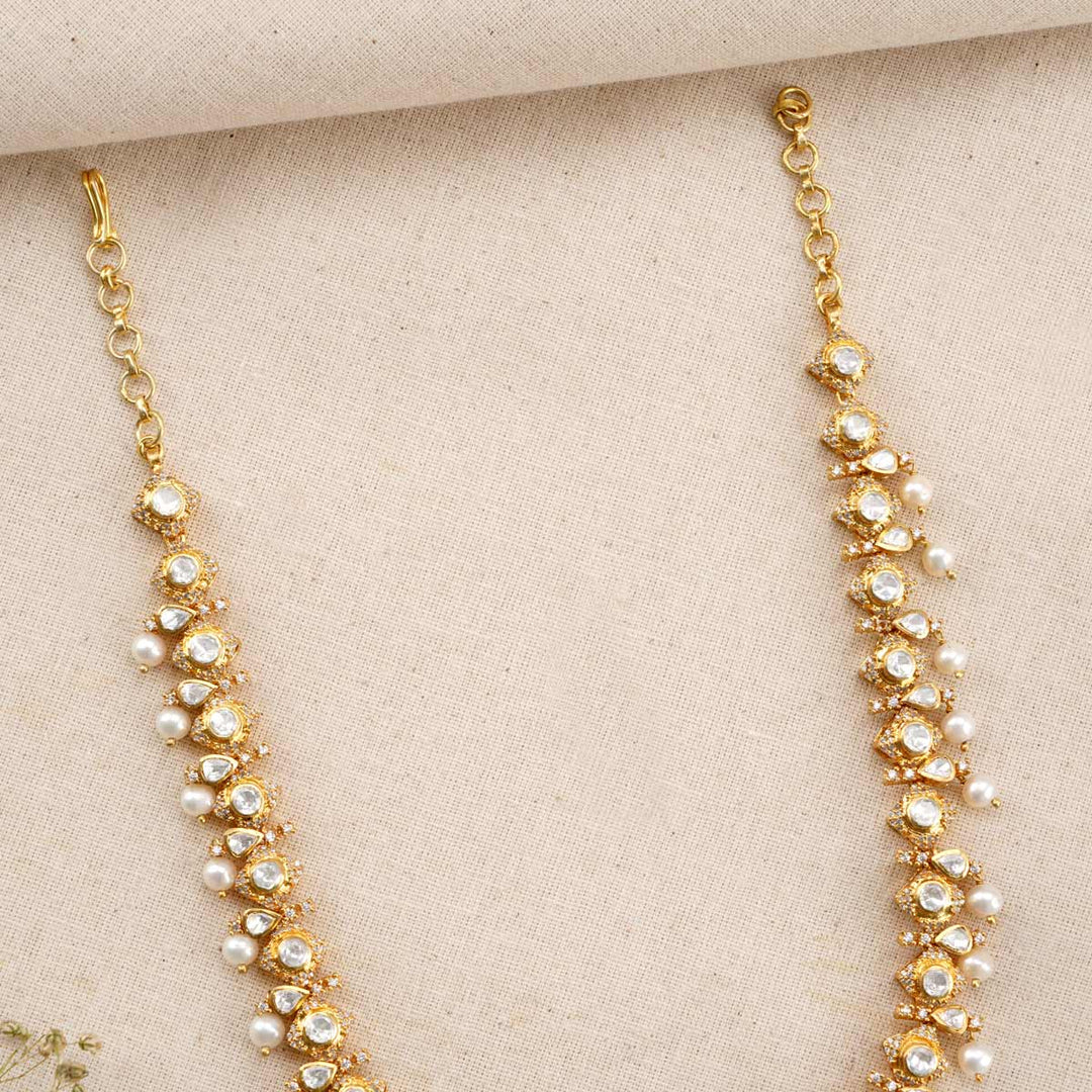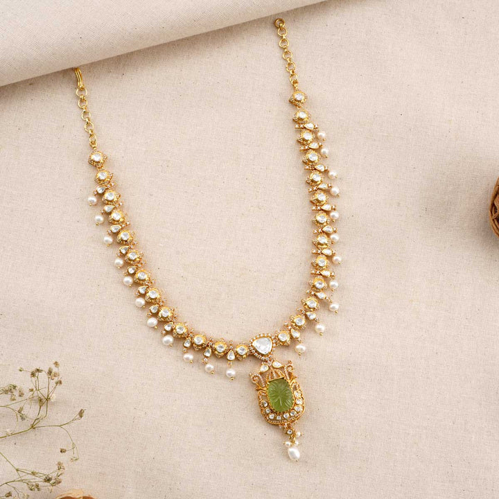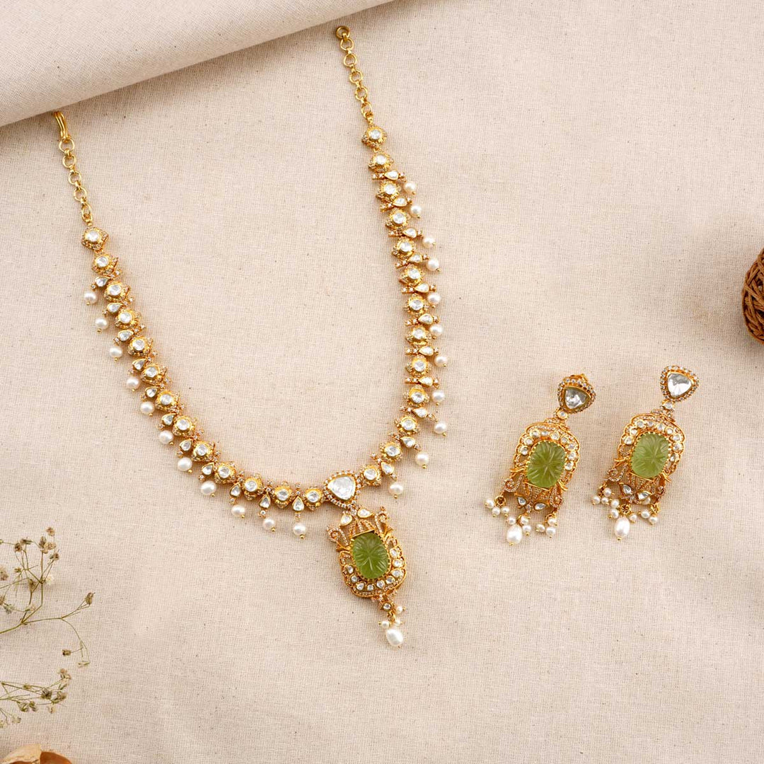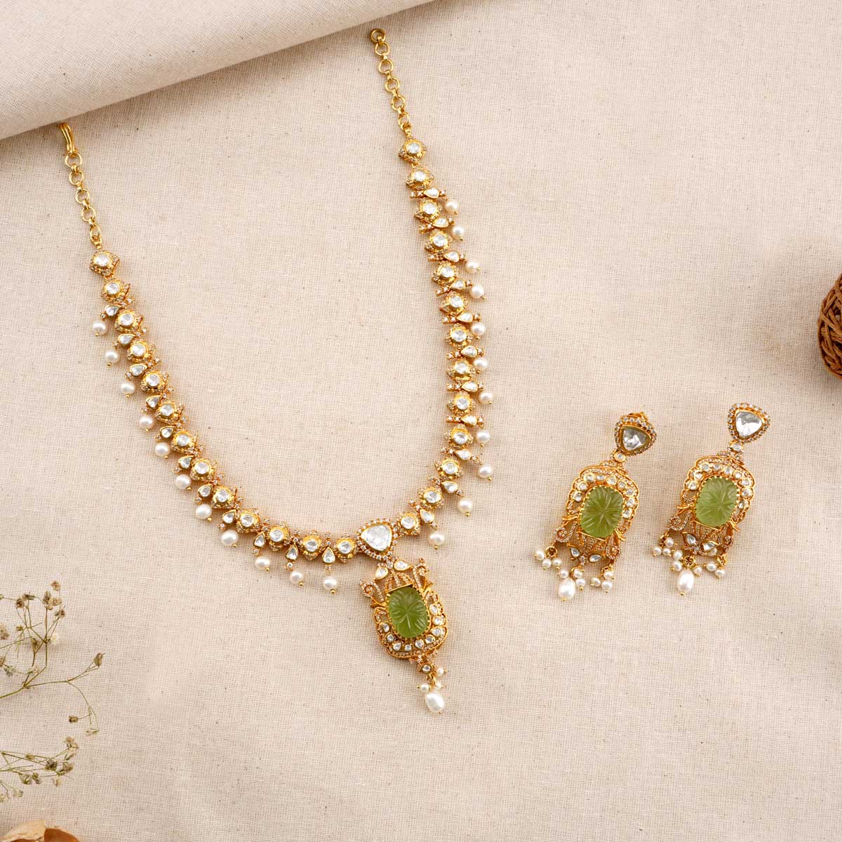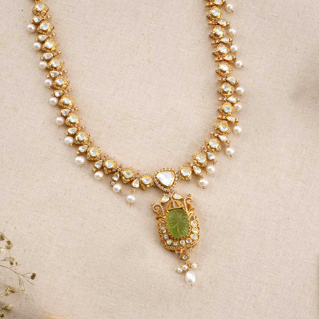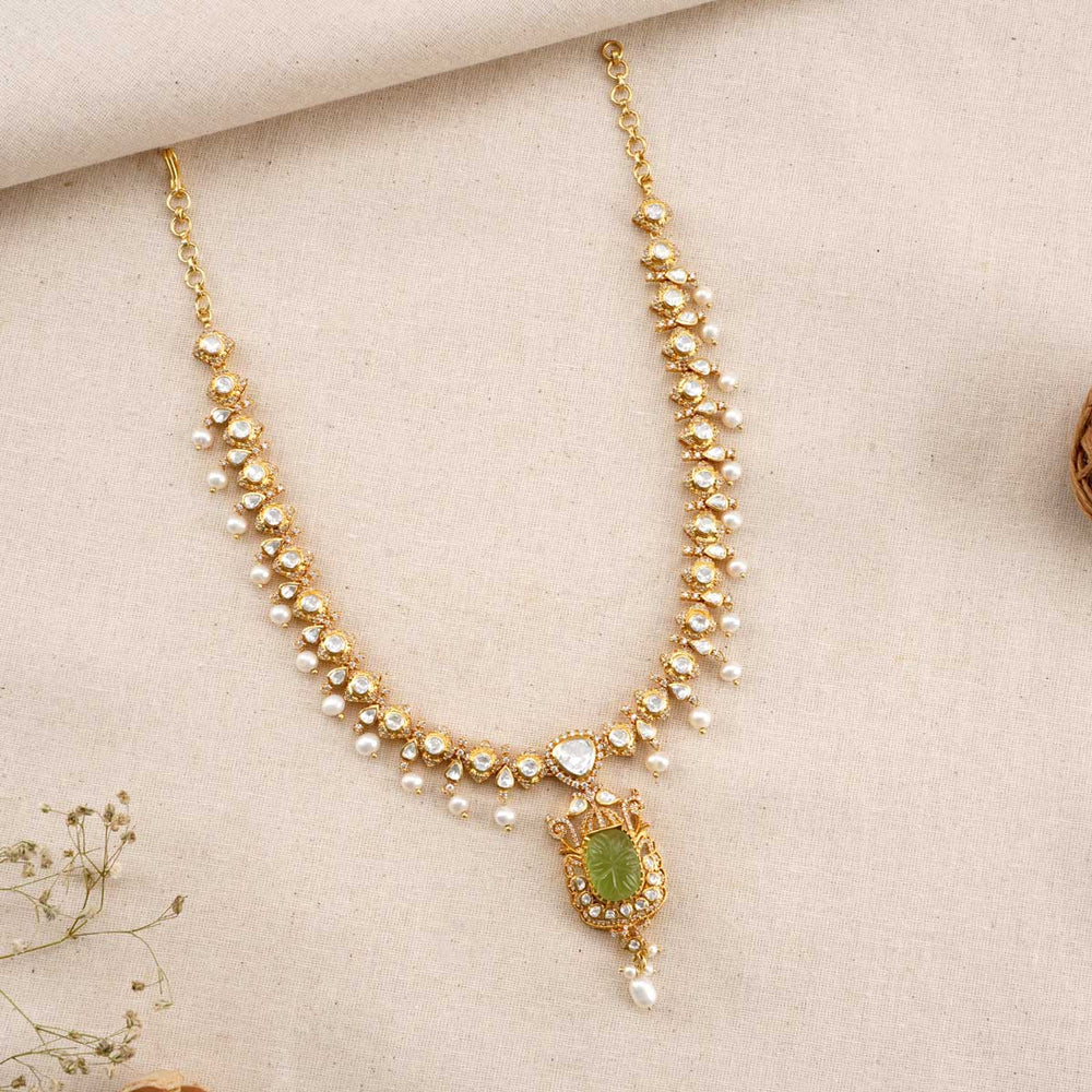 This 92.5 Silver, 24 kt gold-plated stylish Necklace is studded with semi-precious stones to make a stunning statement. Perfect for any special occasion.