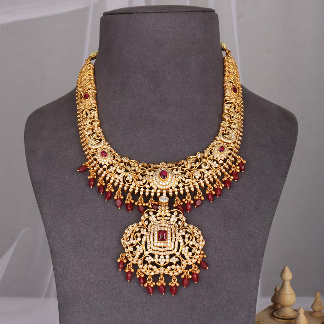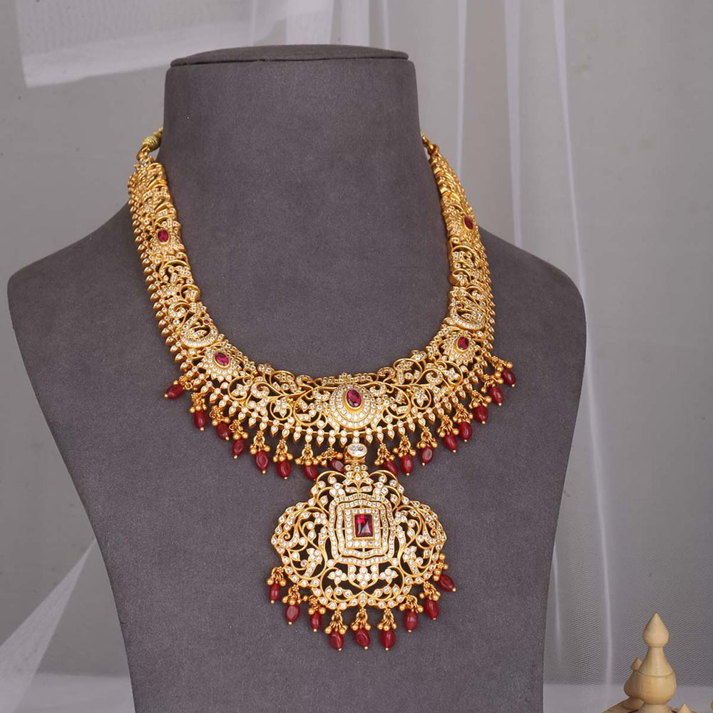 This 92.5 Silver, 24 kt gold-plated stylish Necklace is studded with semi-precious stones to make a stunning statement. Perfect for any special occasion.