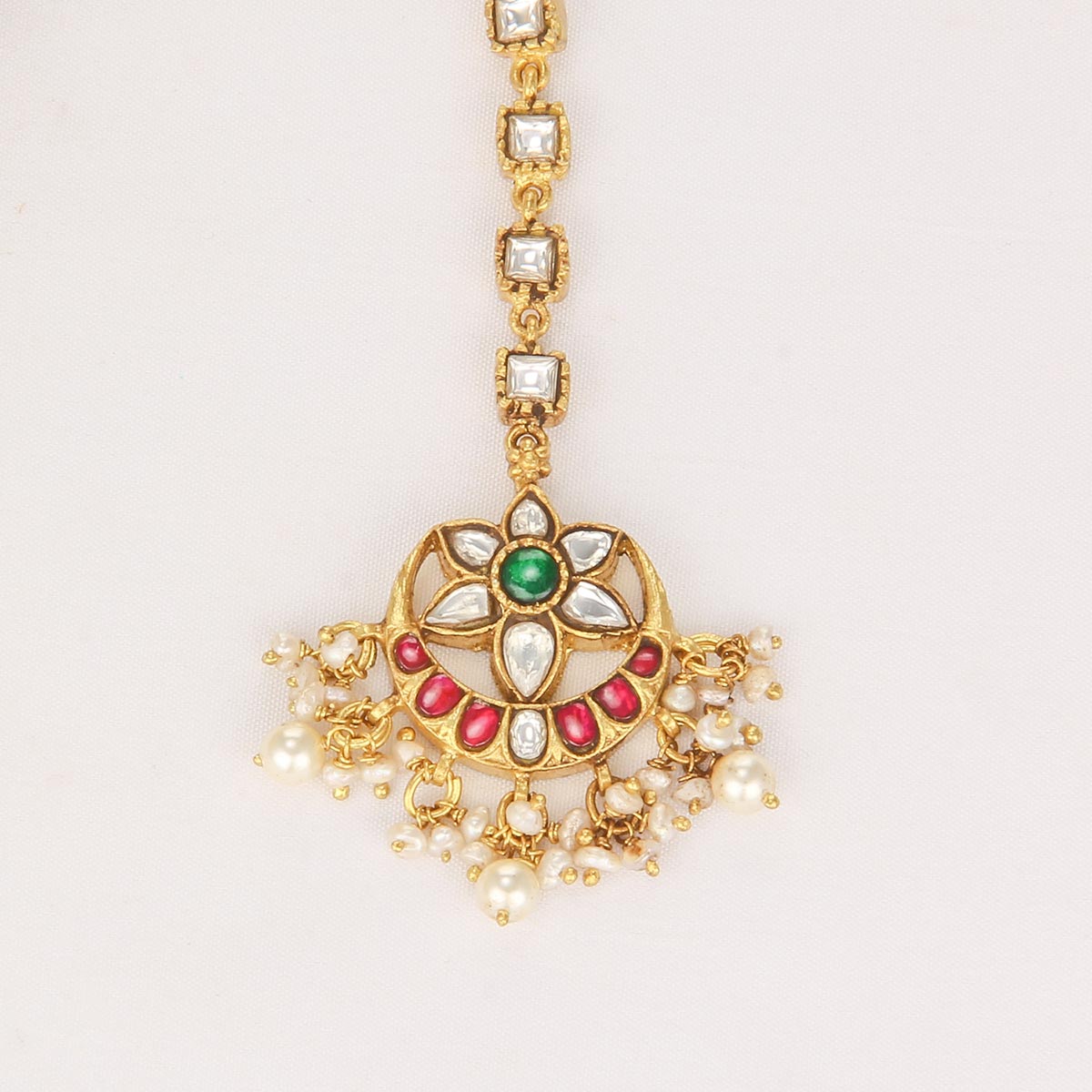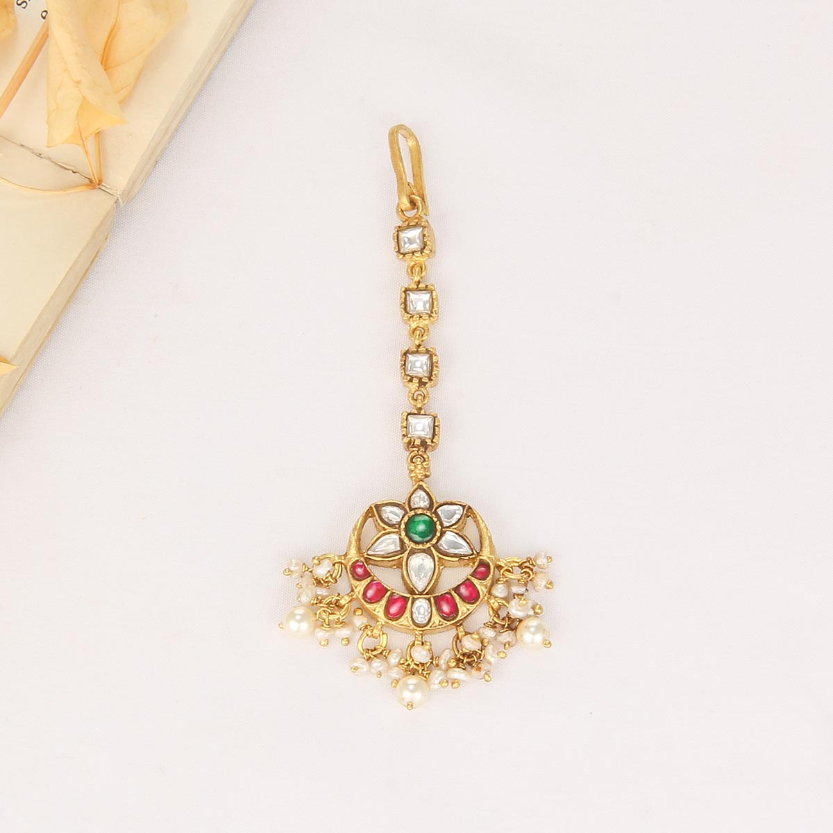 This 92.5 Silver, 24 kt Gold-Plated Maangtikka is adorned with Semi-precious Kundan Stones for a luxurious aesthetic.