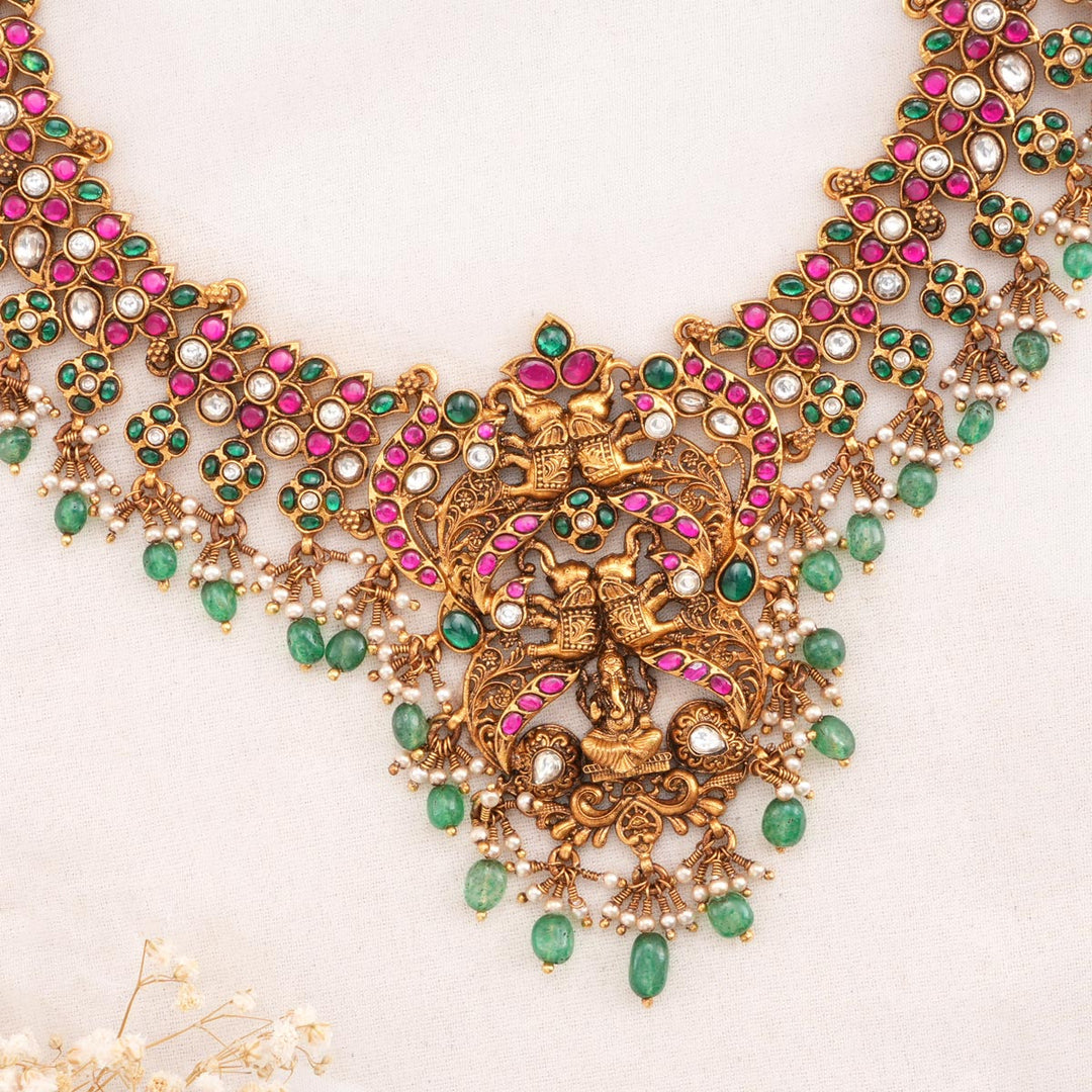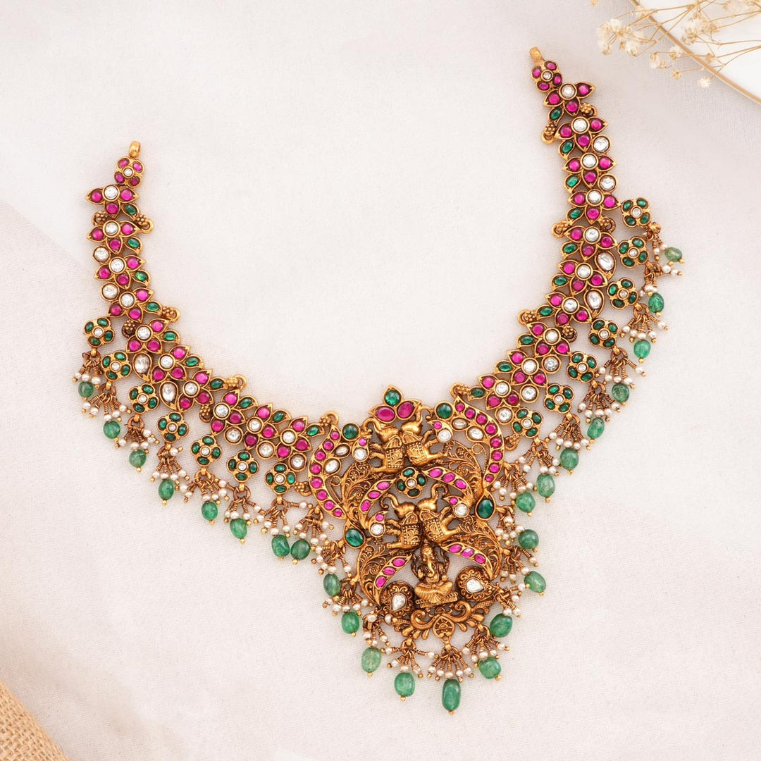 This 92.5 Silver, 24 kt Gold-Plated Necklace is adorned with Semi-precious Kundan Stones for a luxurious aesthetic.
