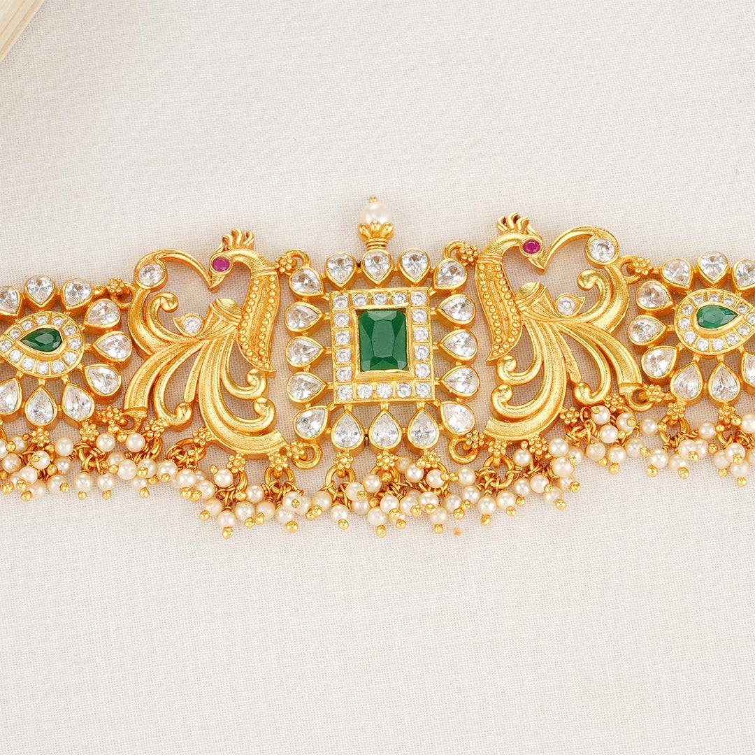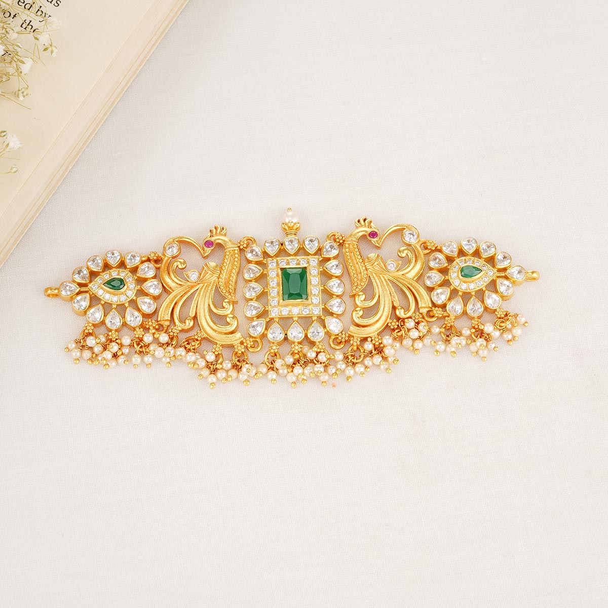 This 92.5 Silver, 24 kt gold-plated stylish Necklace is studded with semi-precious stones to make a stunning statement. Perfect for any special occasion.