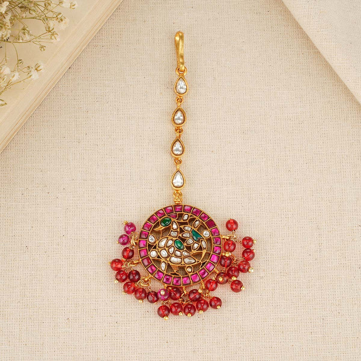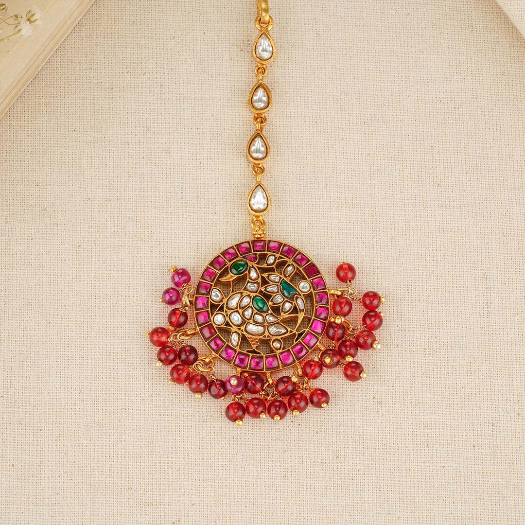 This 92.5 Silver, 24 kt Gold-Plated Maangtikka is adorned with Semi-precious Kundan Stones for a luxurious aesthetic.