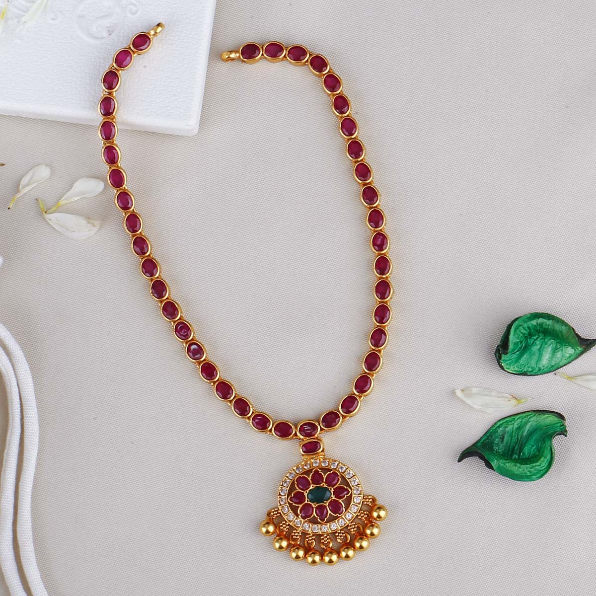 This 92.5 Silver, 24 kt gold-plated stylish Necklace is studded with semi-precious stones to make a stunning statement. Perfect for any special occasion.