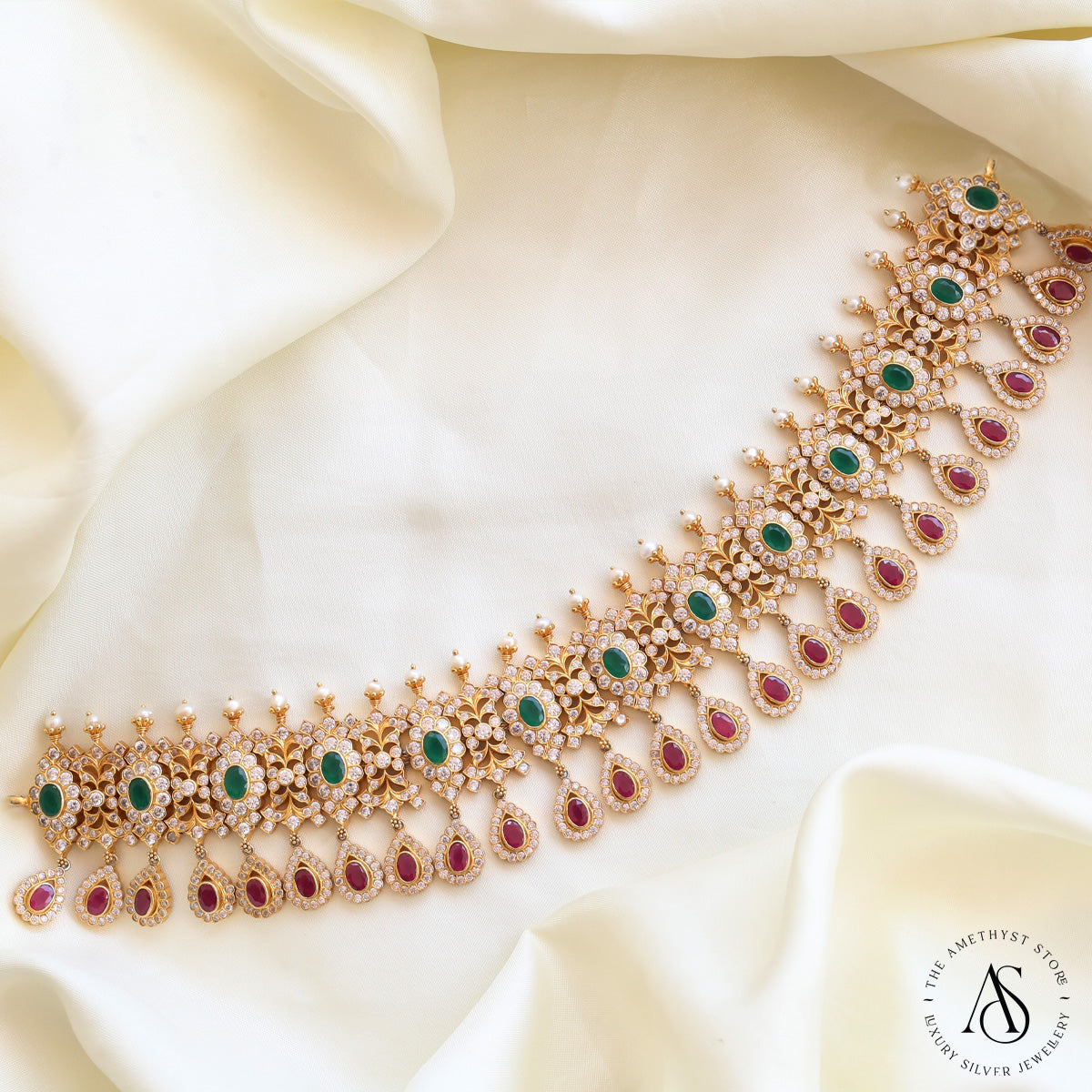 This 92.5 Silver, 24 kt gold-plated stylish Necklace is studded with semi-precious stones to make a stunning statement. Perfect for any special occasion.