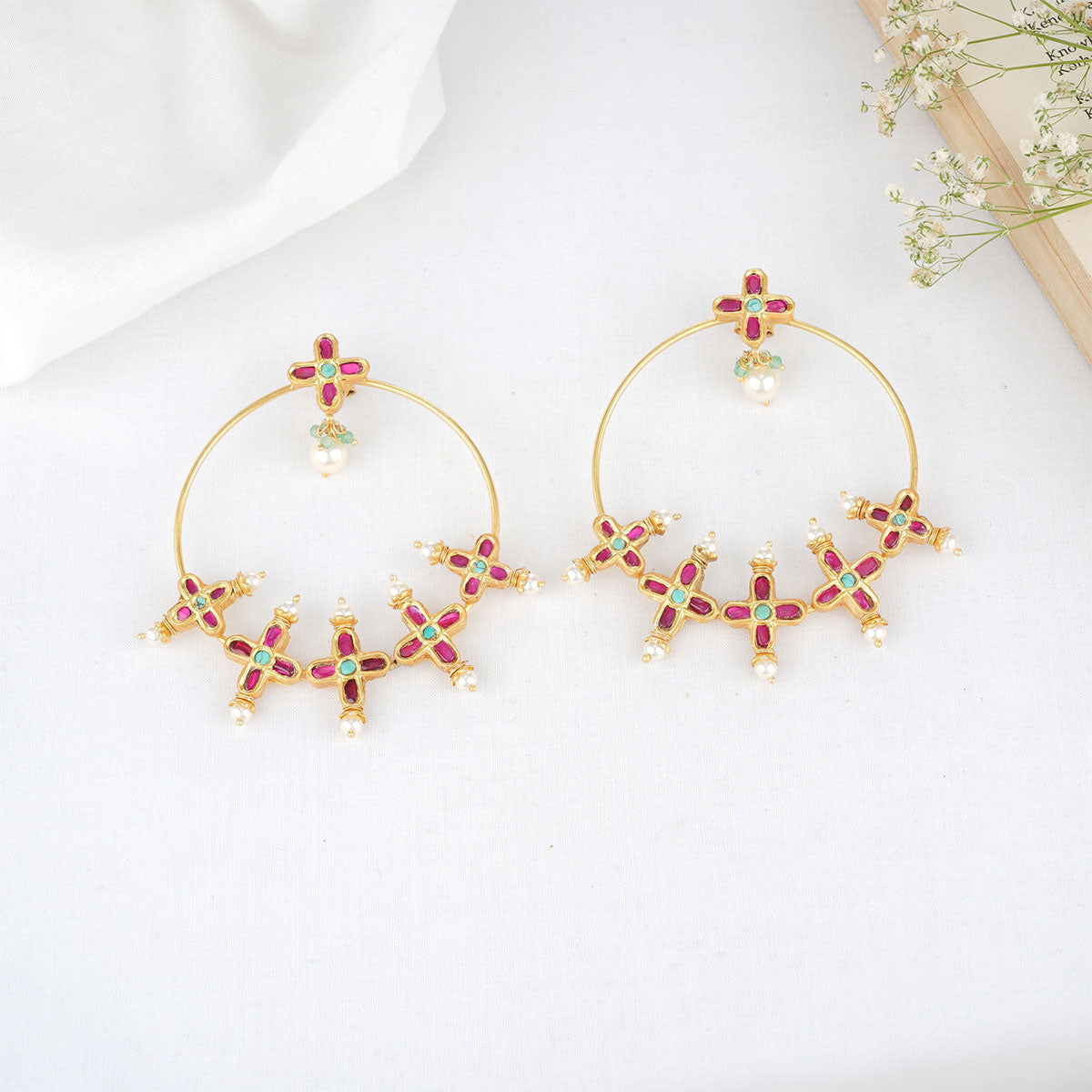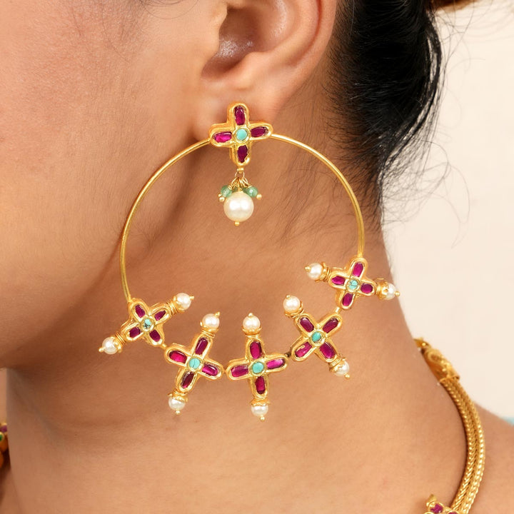 This 92.5 Silver, 24 kt Gold-Plated Earring is adorned with Semi-precious Kundan Stones for a luxurious aesthetic.
